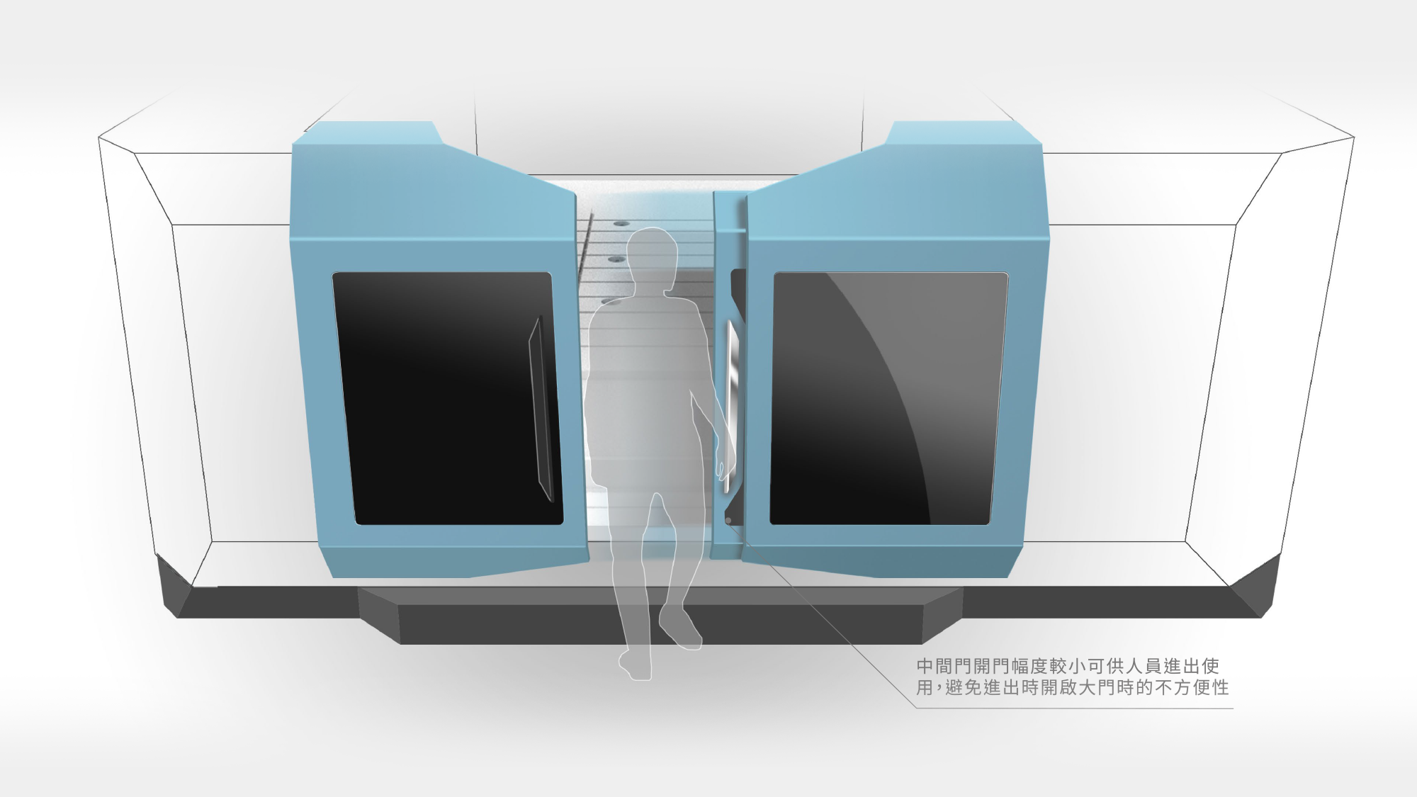 針對大型門片開啟時不方便的痛點,設計「子母門結構」,設置小幅度開啟的中間門供人員頻繁進出,減少驅動大型門片的能源損耗與時間成本。