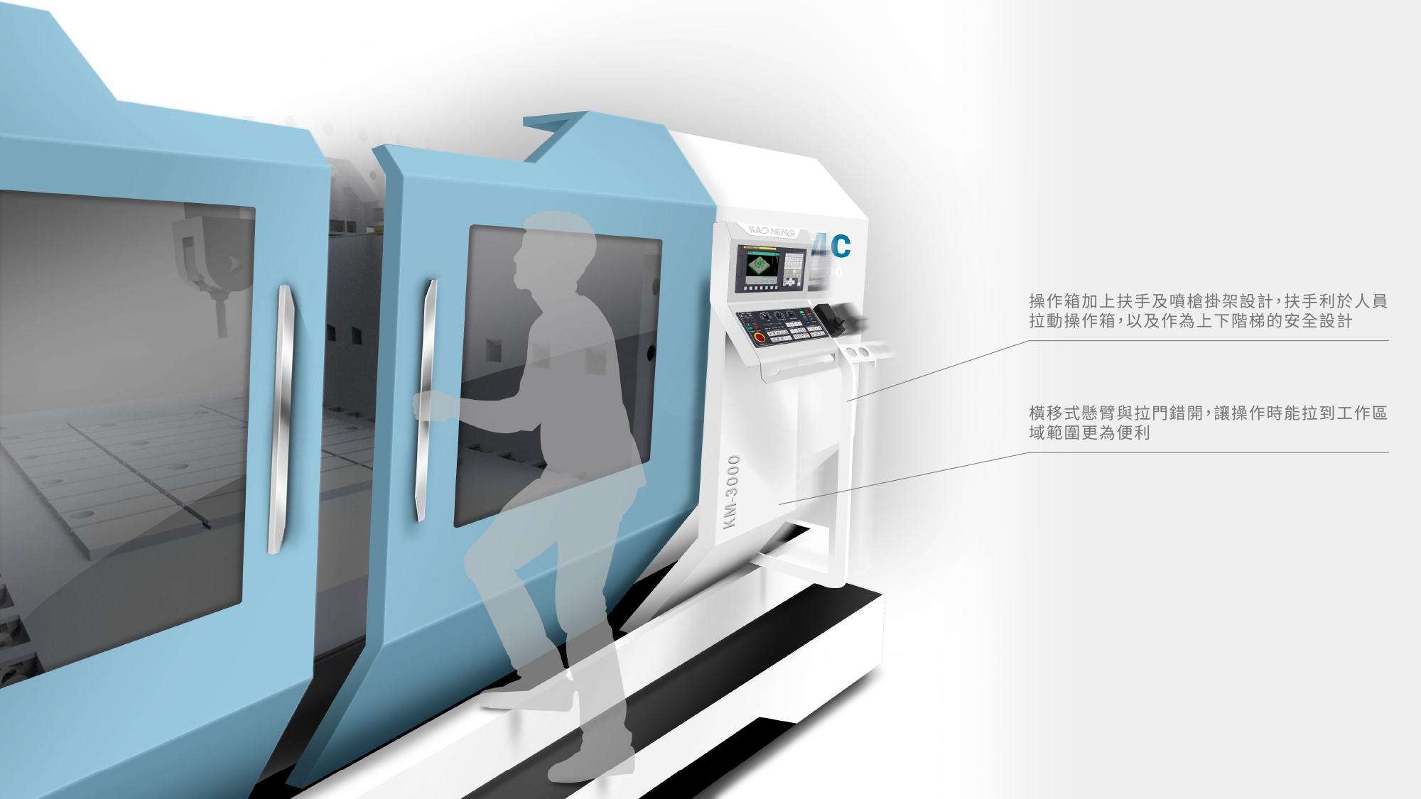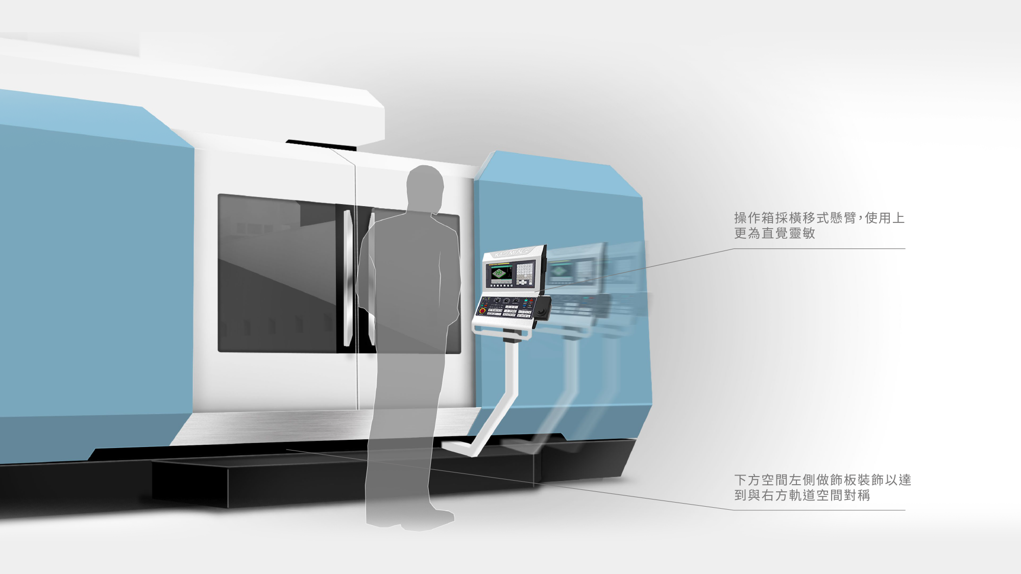 下懸式橫移懸臂與空間平衡: 採用下懸式橫移懸臂,讓操作介面移動路徑更直覺靈敏,且視覺收納更為簡潔;左側輔以裝飾飾板與右方軌道空間達成對稱,強化龍門機特有的穩重感。