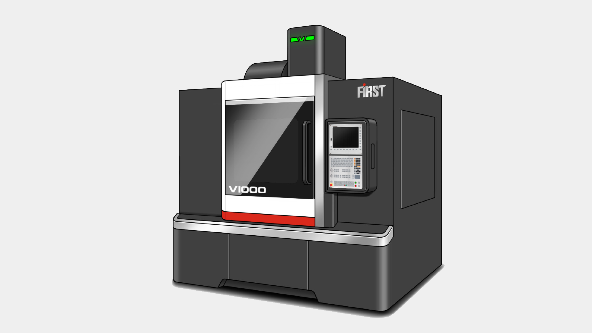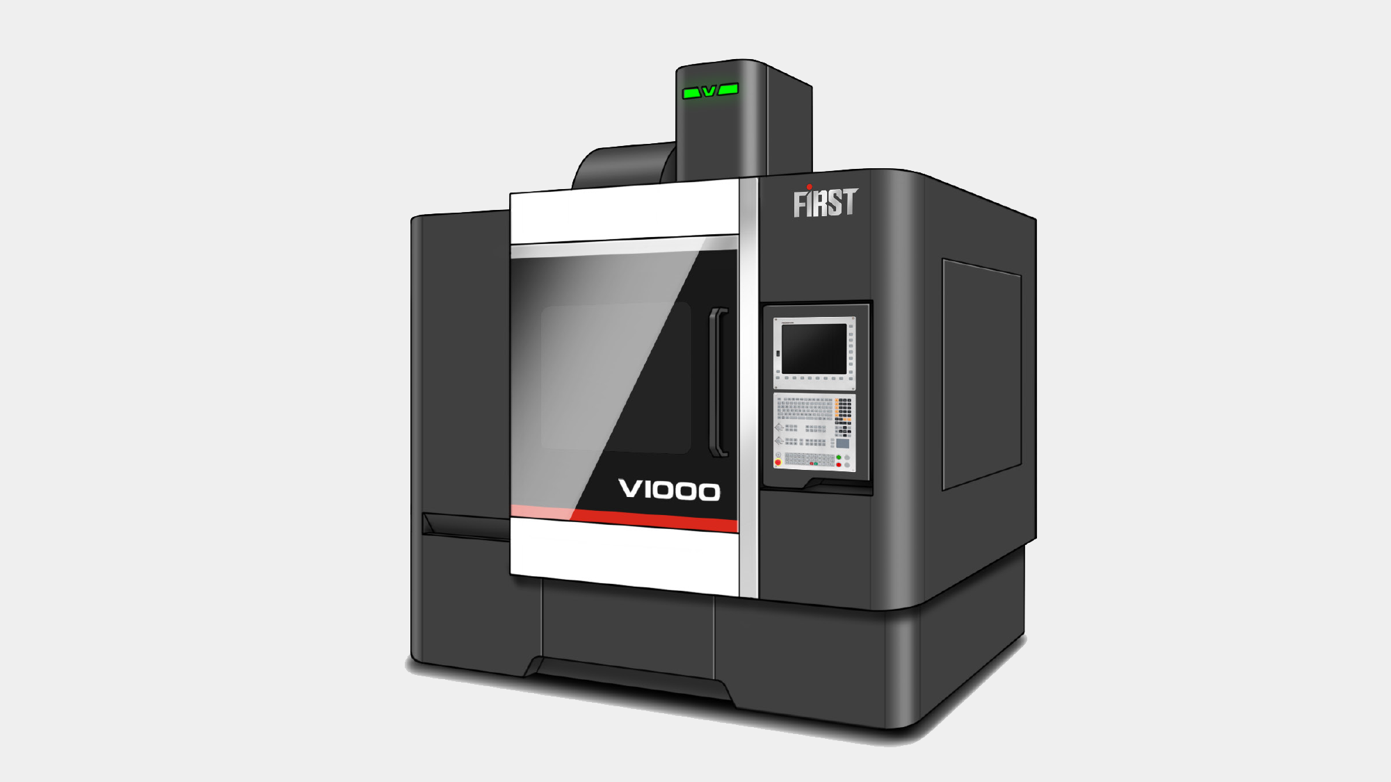 龍昌機械 V1000 是一款用途廣泛的高性能五軸加工機種。面對複雜的五軸聯動空間需求與巨大的設備量體,形碩設計的挑戰在於如何透過板金視覺演繹其「極致性能」。我們不僅維持了 V 系列的家族識別,更針對五軸加工的動態特性,重構了機殼的幾何層次,讓 V1000 在展現重型切削剛性的同時,亦散發出精密五軸設備應有的智慧科技感。
