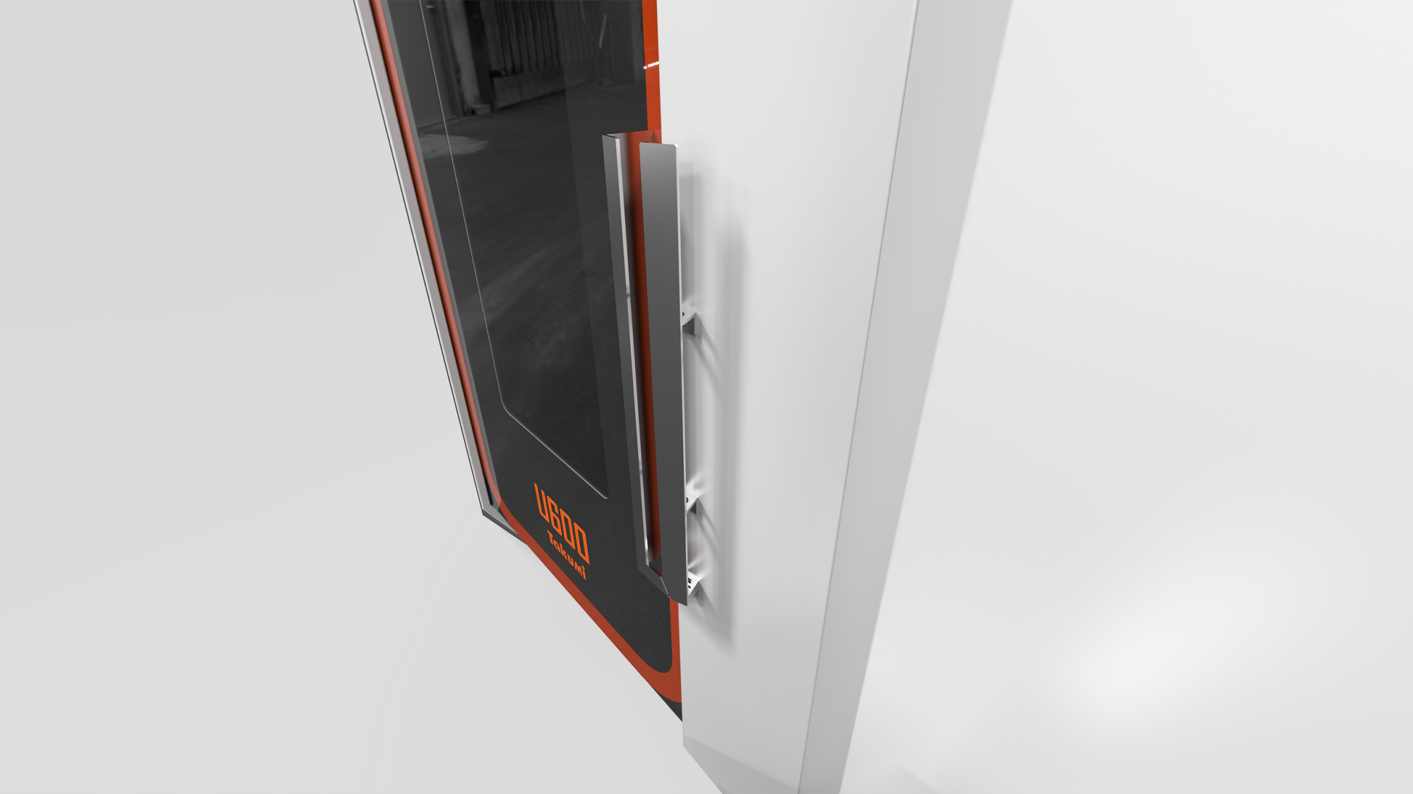 旋轉式最大幅開門:為實現提案 B 「歡迎進入」的視覺承諾,3D 結構捨棄傳統滑軌,研發出專屬的旋轉式開門機構。這不僅符合斜切面的幾何特色,更達成了工作門的最大開門幅度,讓大型工件的進出與校正擁有前所未有的自由度。