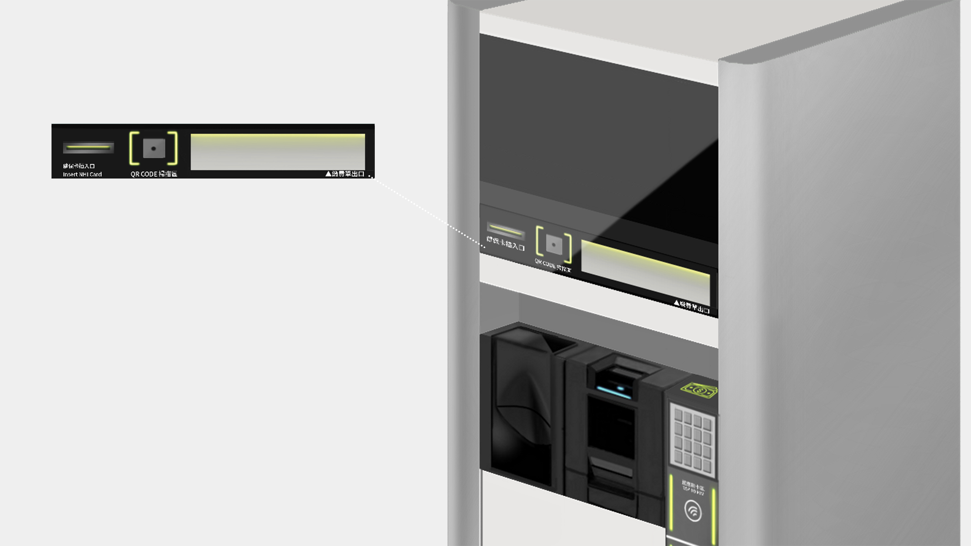直覺操作區: 以壓克力飾板高度整合 QR 碼與插卡槽,並透過印刷線條與對應燈號,引導使用者進行精確的操作動線。