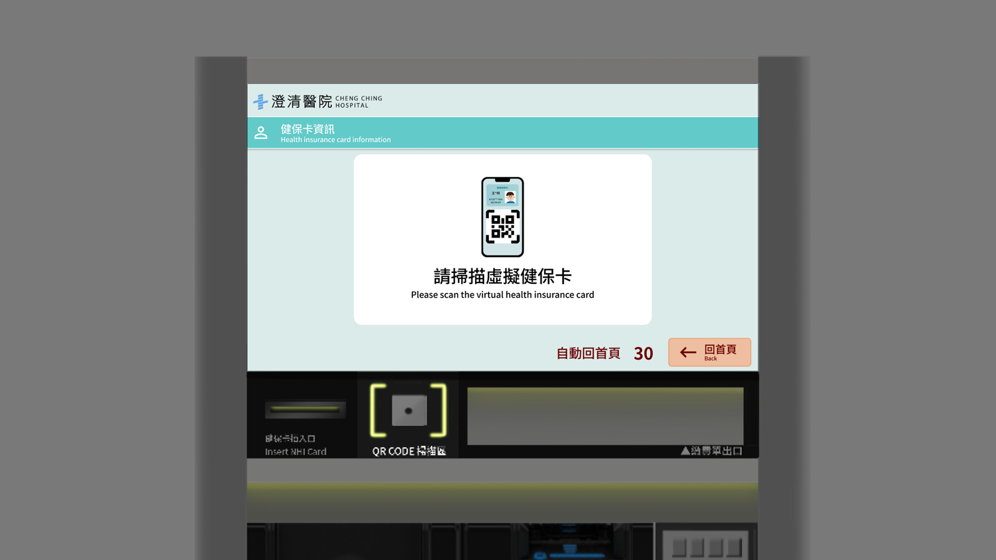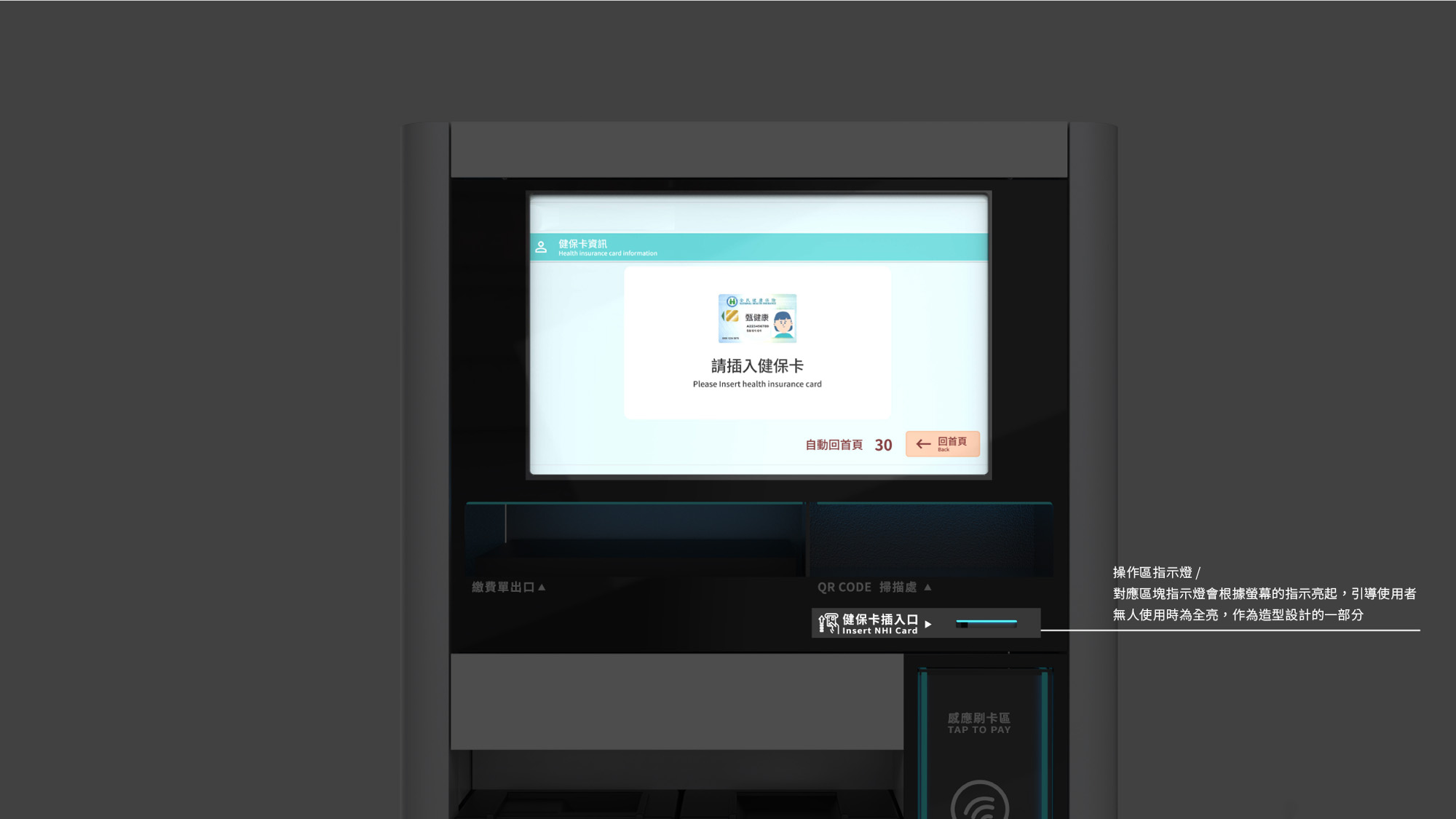 流程整合面板: 將健保卡插入、單據掃描與收據領取等功能與螢幕整合於同一壓克力面板,形成垂直的操作流向。