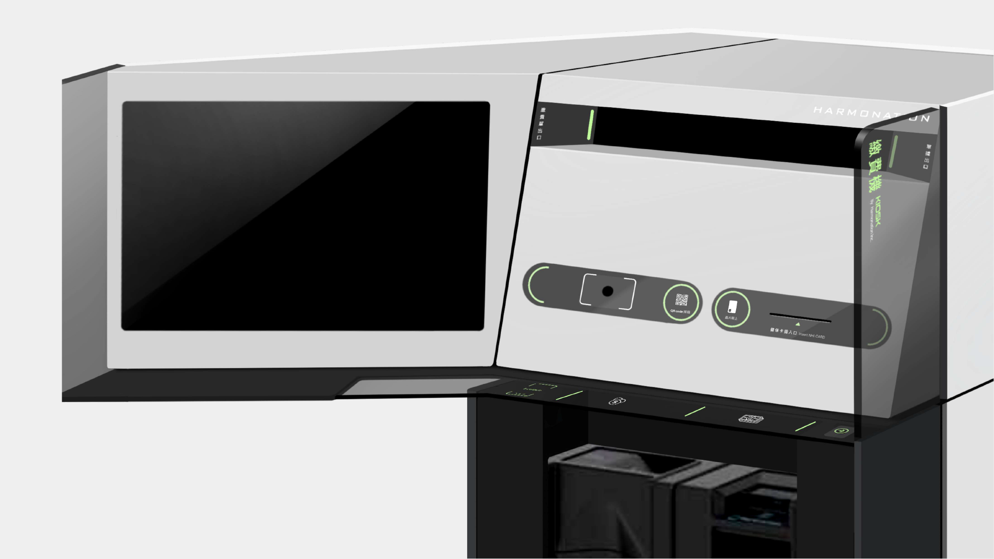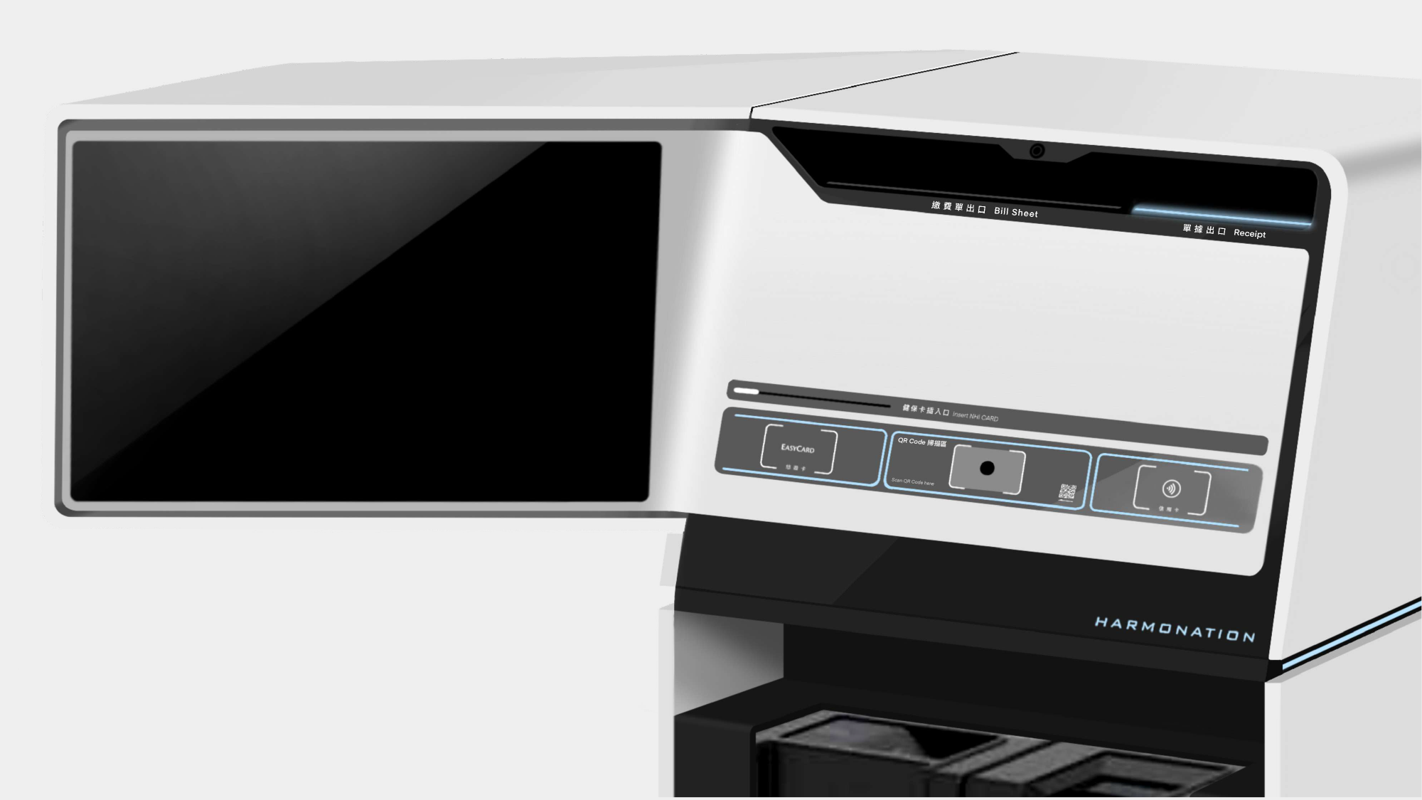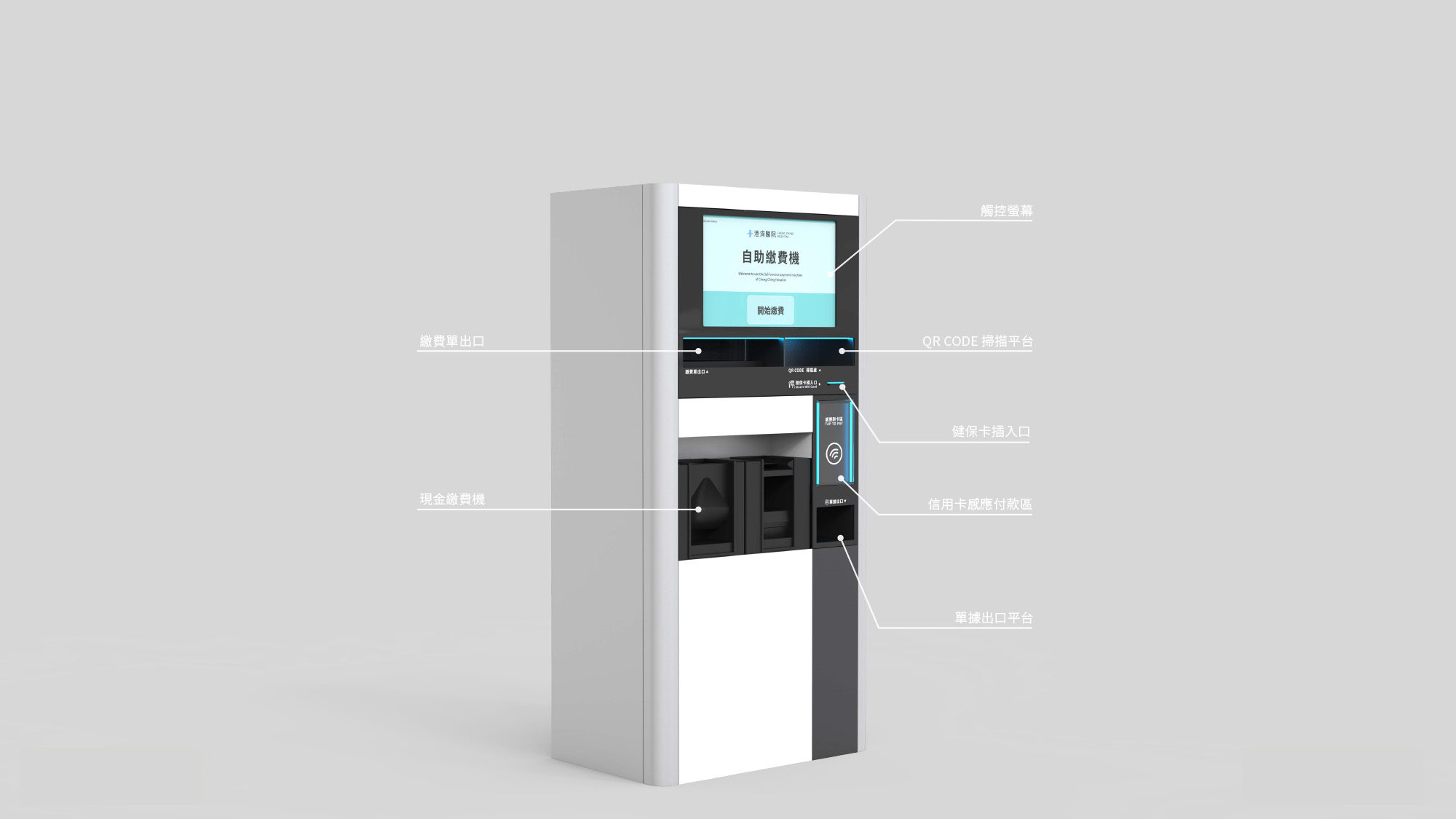 針對醫院繳費環境對「低壓迫感」與「高直覺度」的雙重需求,形碩設計採取了「柔和幾何」與「功能區塊化」的優化策略。我們透過圓潤的導角消弭設備的尖銳感,使其自然融入醫療環境;並利用黑色壓克力面板作為視覺錨點,精確整合掃碼、讀卡與現金投入區,配合動態燈號指引,確保跨語系與不同認知能力的患者都能順暢完成交易流程。