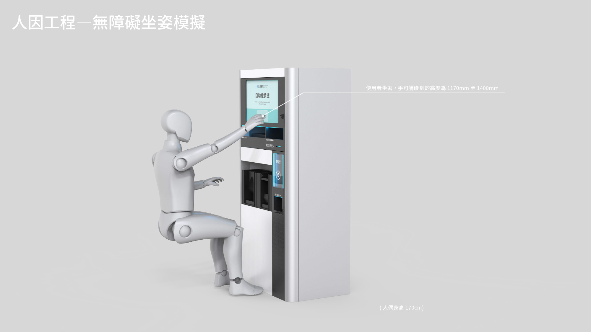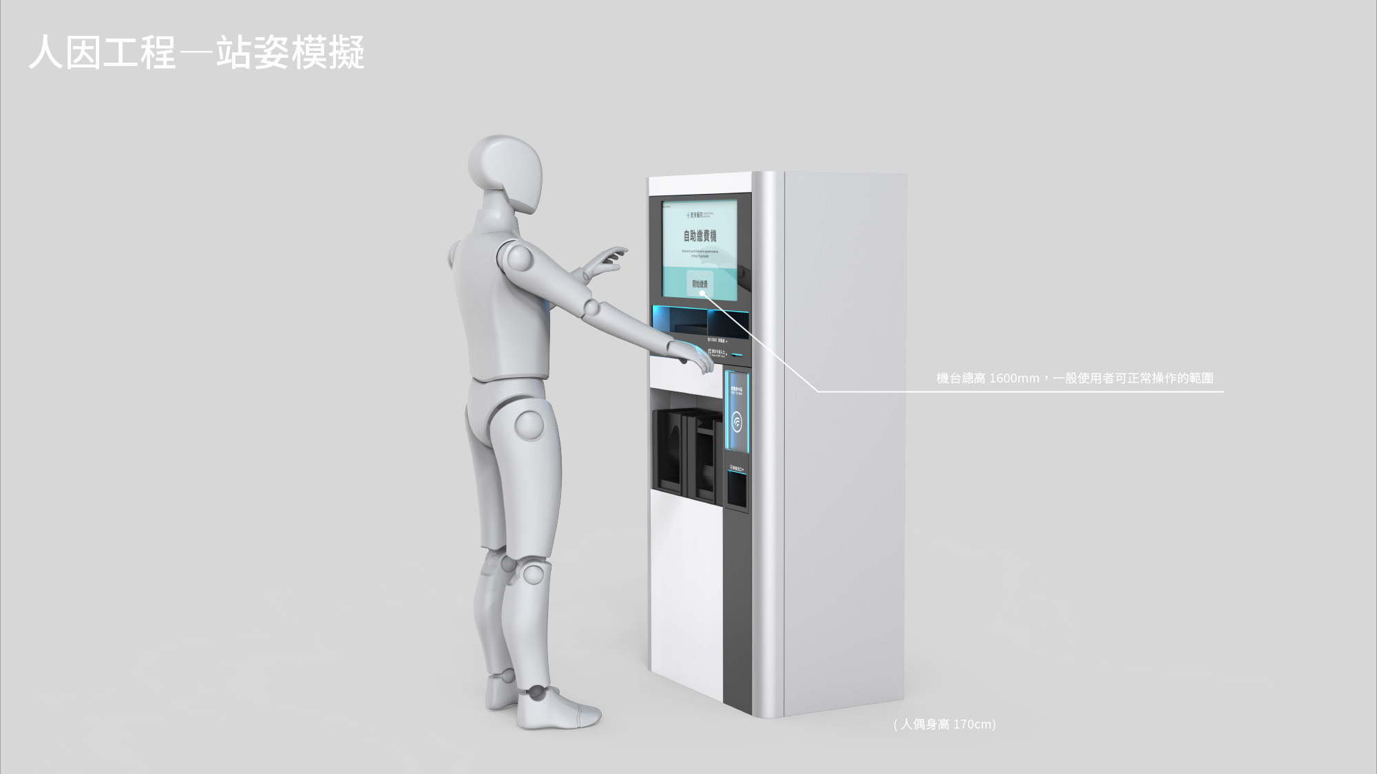 視線與動線優化:機台總高設定為 1600mm,方便一般使用者觀看直立式螢幕並進行操作 。