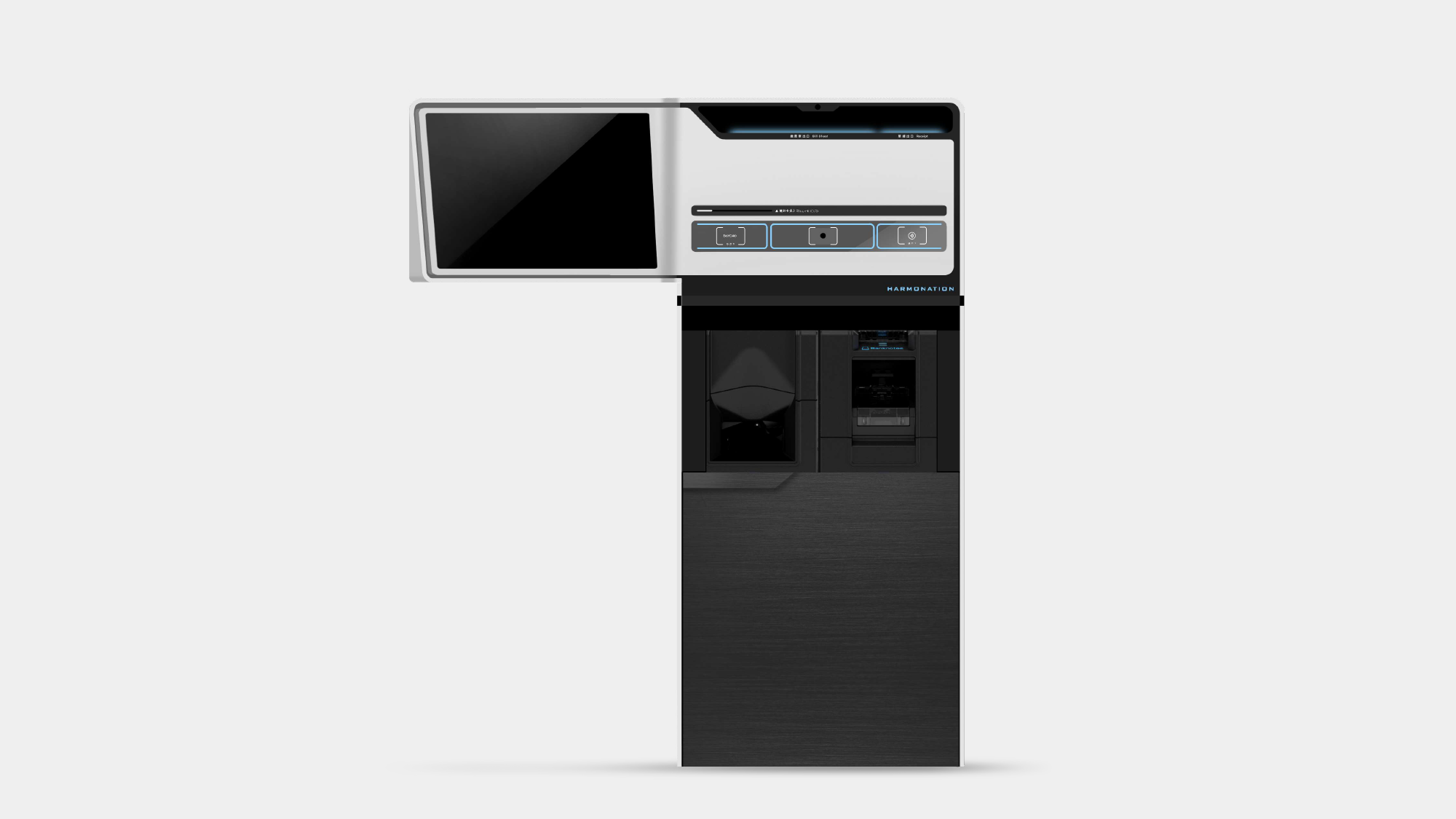 特別選用銀色噴砂質感的板金材質,透過金屬細膩的質地強調智慧終端的科技感與精密工藝。最後,以品牌藍色線條與指示燈號作為視覺點綴,不僅引導操作流程,更在簡約的黑白層次中劃出鮮明的科技焦點。