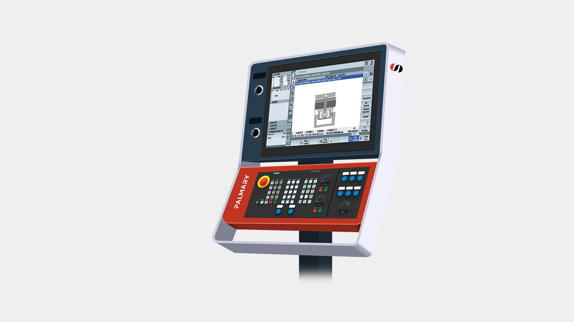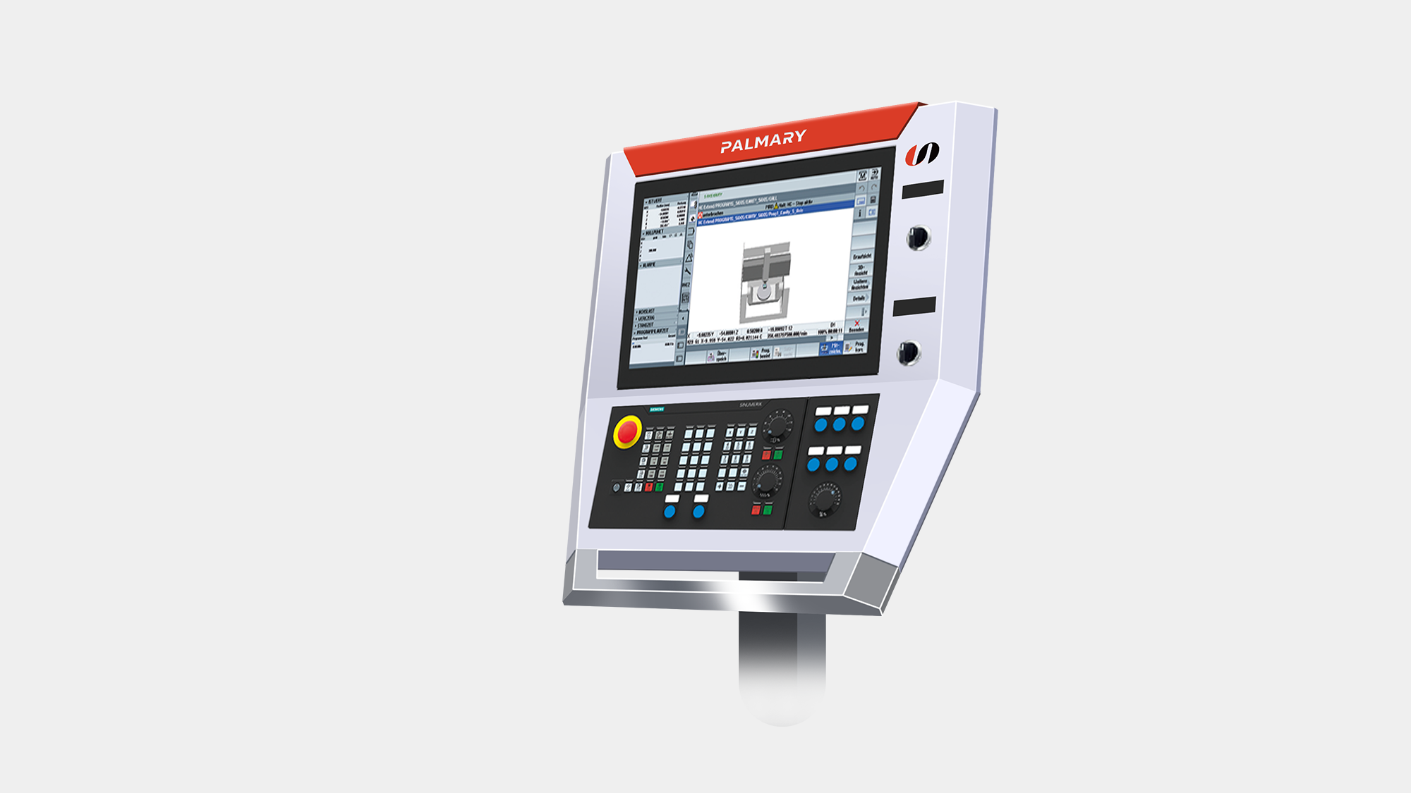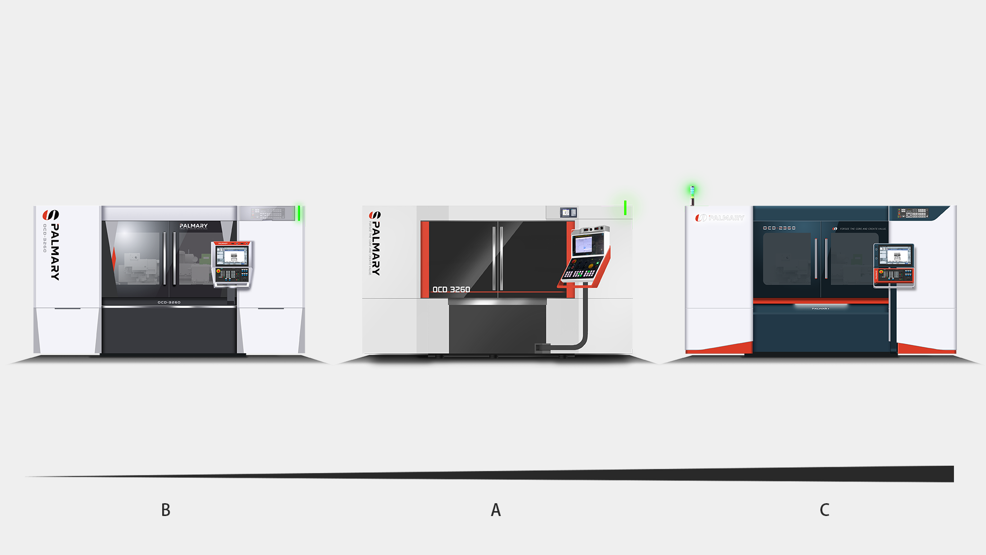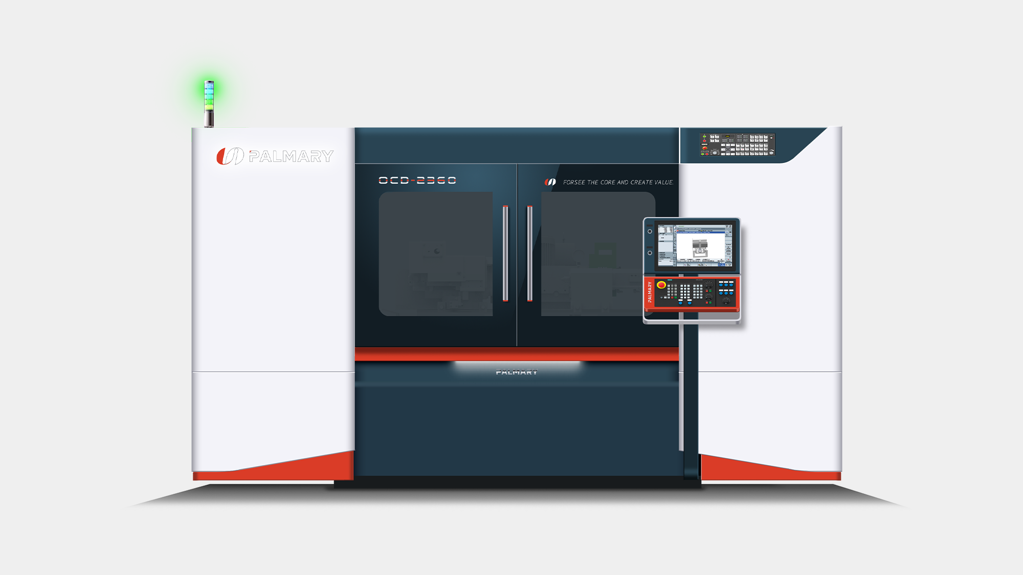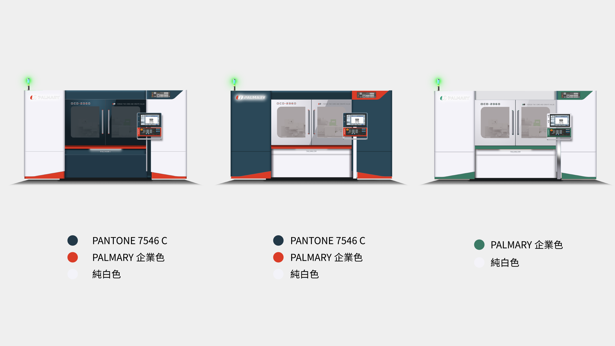 在確定以提案 B 為發展方向後,形碩設計進行至 3D 模擬與結構檢討階段。本階段不僅落實了「精密磨削」的視覺印象,更針對大光長榮(PALMARY)的全球裝櫃需求、操作員站立空間以及品牌識別的精緻度,執行多項工程層面的細節優化,確保設計能完美對接量產實務。