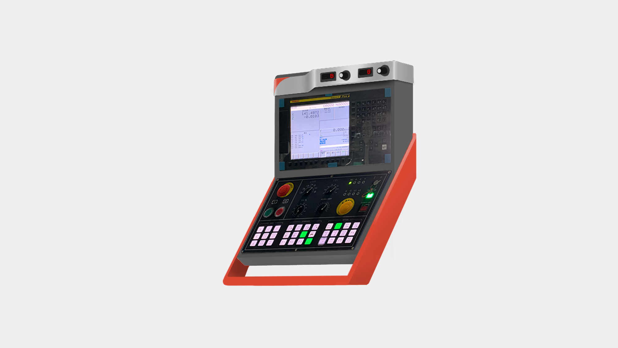 品牌基因整合: 採用下懸臂轉出設計,操作箱左上角呼應企業 Logo 的三角弧形特徵,並以企業色板金圍繞製作把手,結合不鏽鋼飾條標示小旋鈕位置,提升操作精確度與整體質感。
