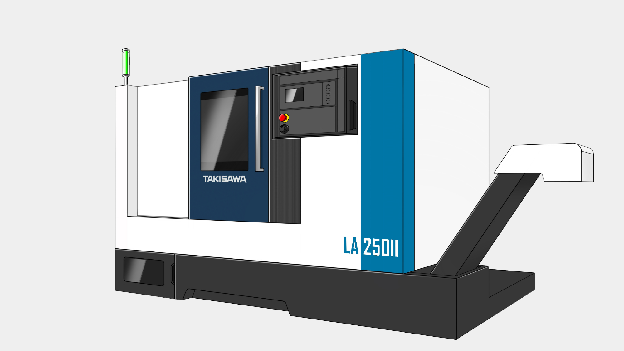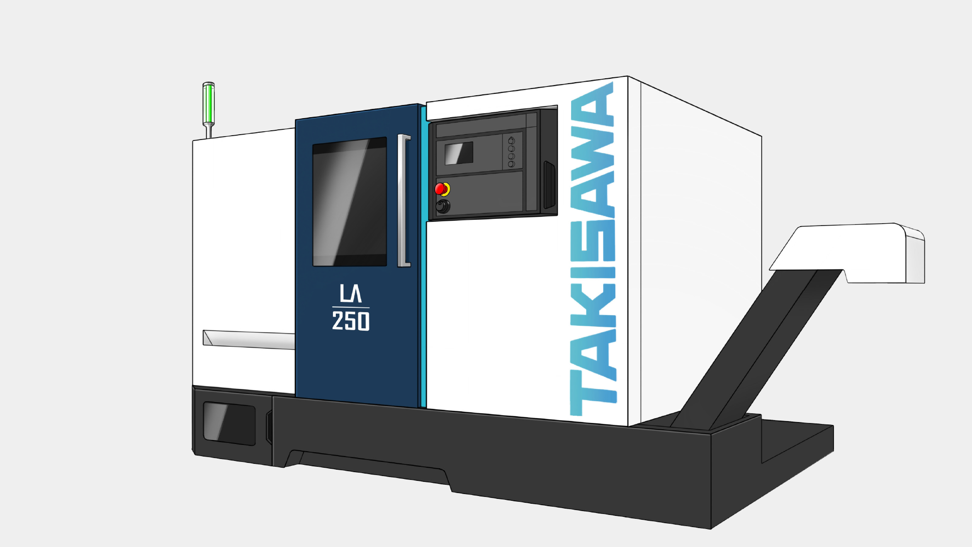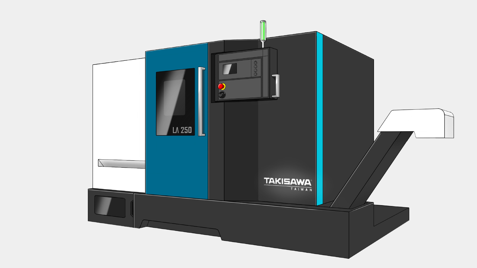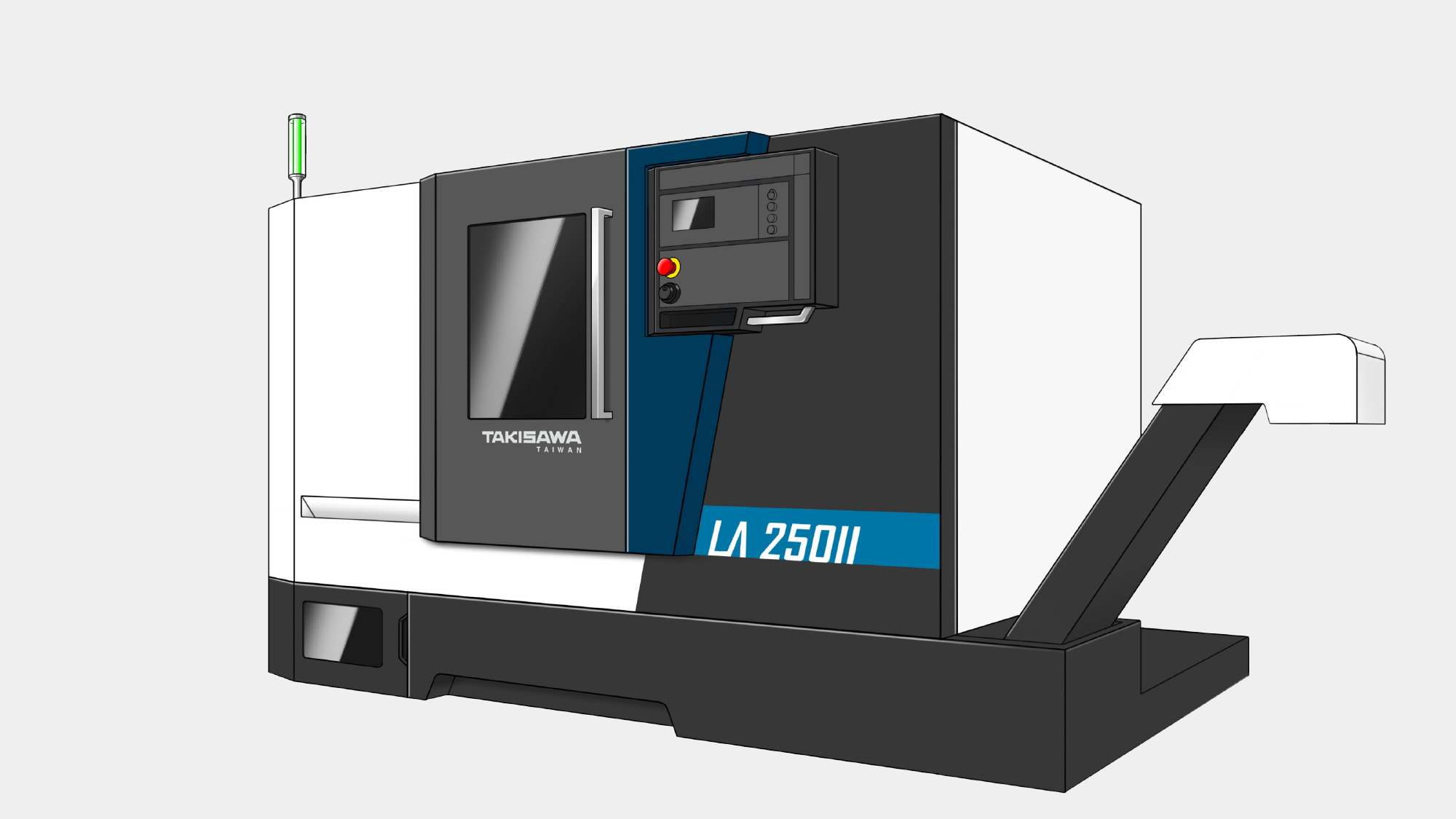 針對台灣瀧澤 LX-2500,形碩設計旨在將「簡潔大方」的風格與「高精度加工」的核心深度整合。首要目標是透過「幾何切割」與「白、灰、黑三主色計畫」,打破傳統機床的厚重感。核心考量聚焦於解決實務操作中的人機衝突:必須優化懸臂操作箱的旋轉動線,確保在 1.3m 的加工長度下,支座造型與機身協調且完全不擋上下料空間。我們力求在嚴苛的工業環境中,重塑一個安全、直覺且具備國際競爭力的專業加工場域。