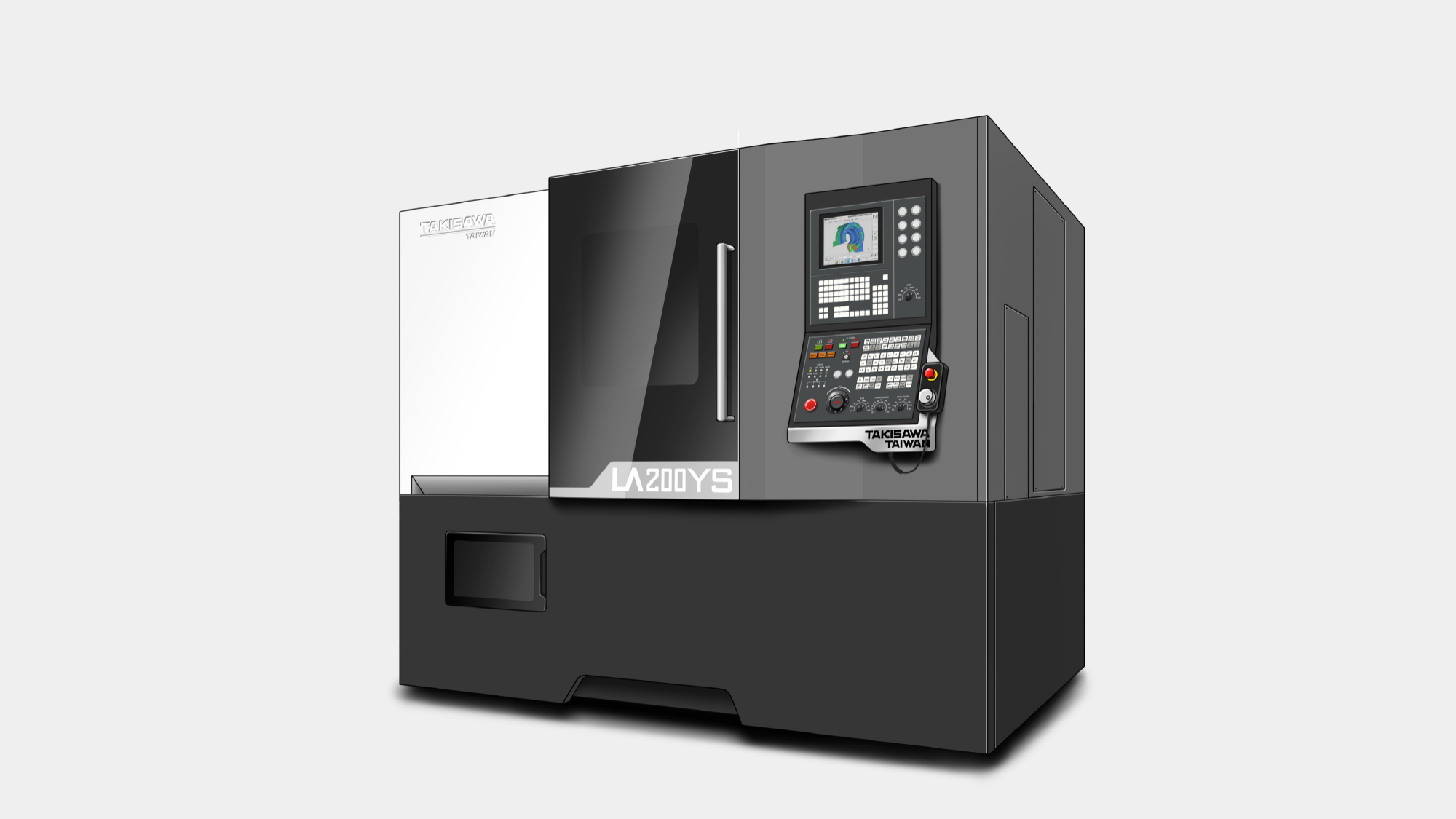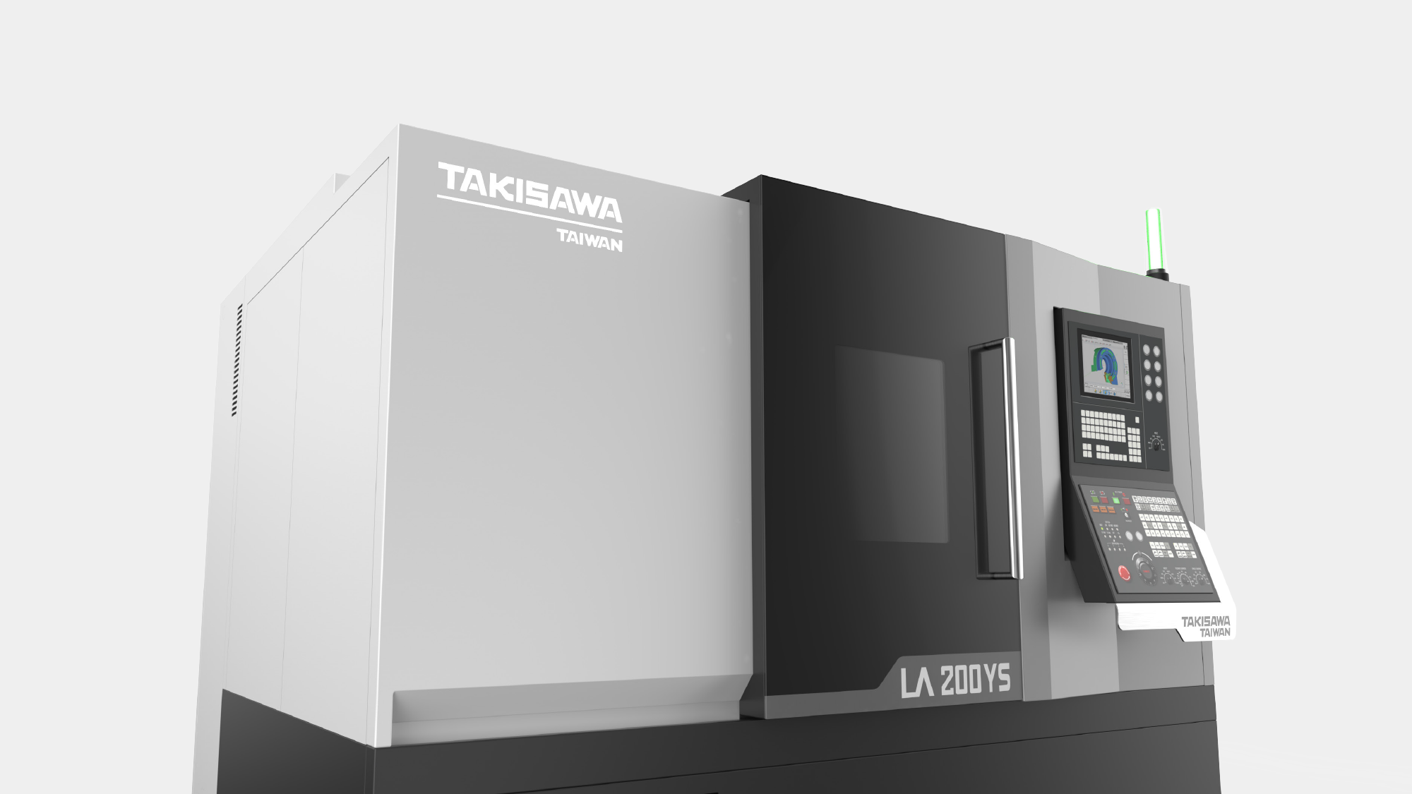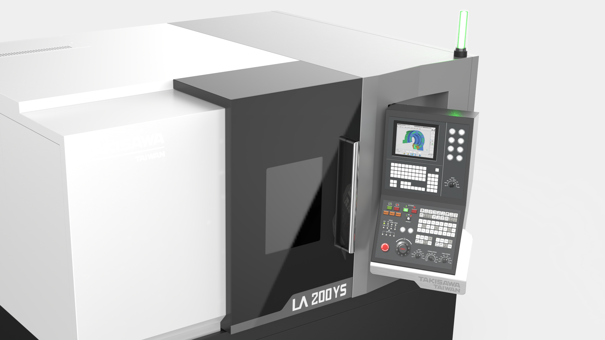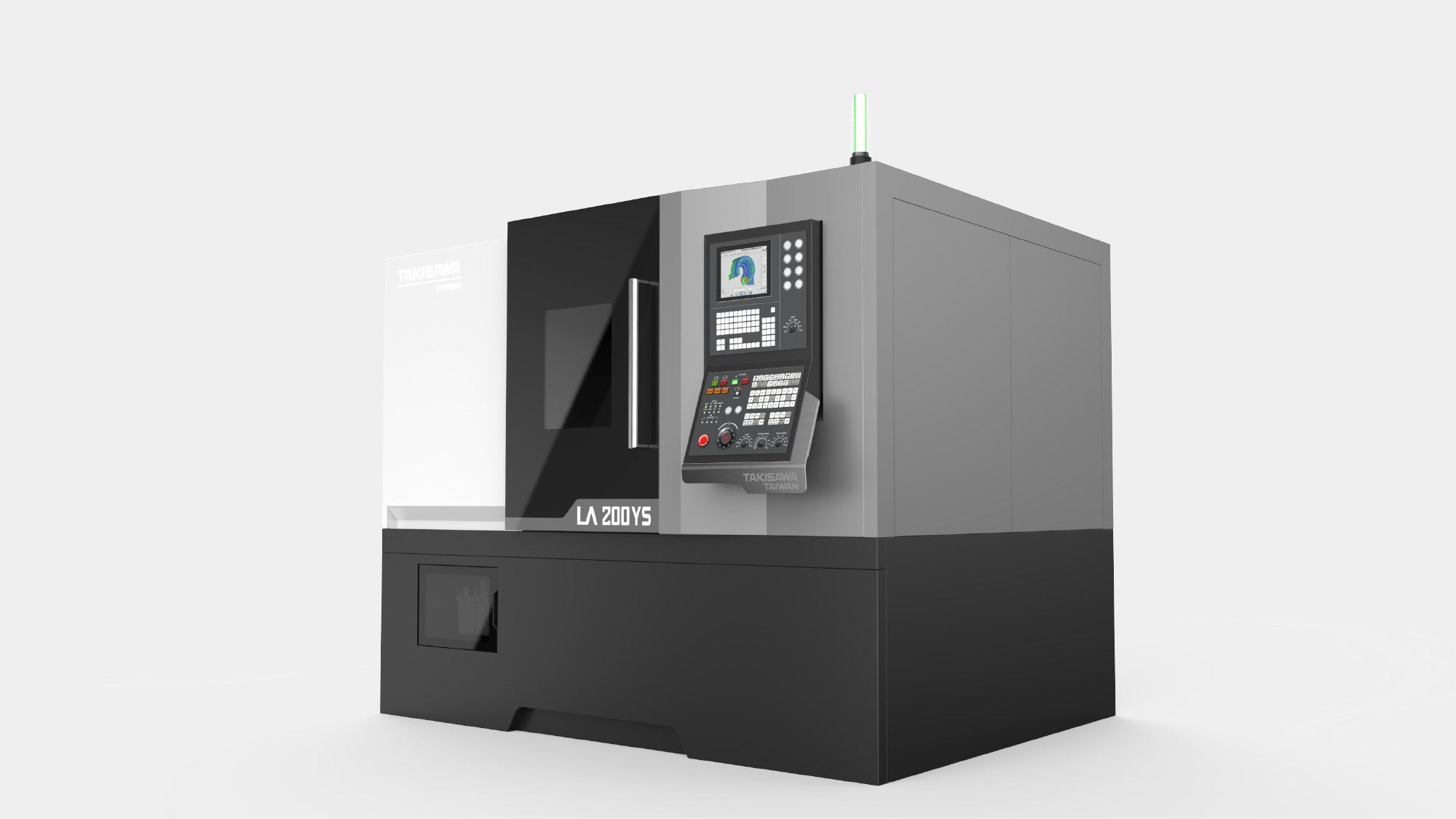 本專案旨在為台灣瀧澤 NX2000 建立具備國際競爭力的視覺高度。首要目標在於實踐「簡潔大方」的外觀風格,並透過板金設計區分高低階機種的差異化。在人機互動層面,核心挑戰在於優化懸臂形式操作箱,確保其在旋轉過程與雙向使用下,完全不會阻礙使用者進行工件上下料的動線空間。我們力求在嚴苛的切削環境中,建構一個安全、直覺且具備數位秩序的專業加工場域。