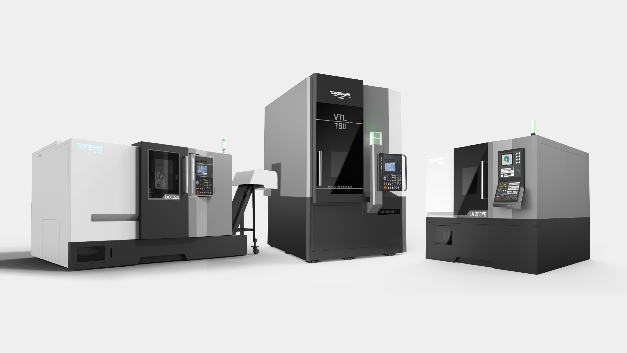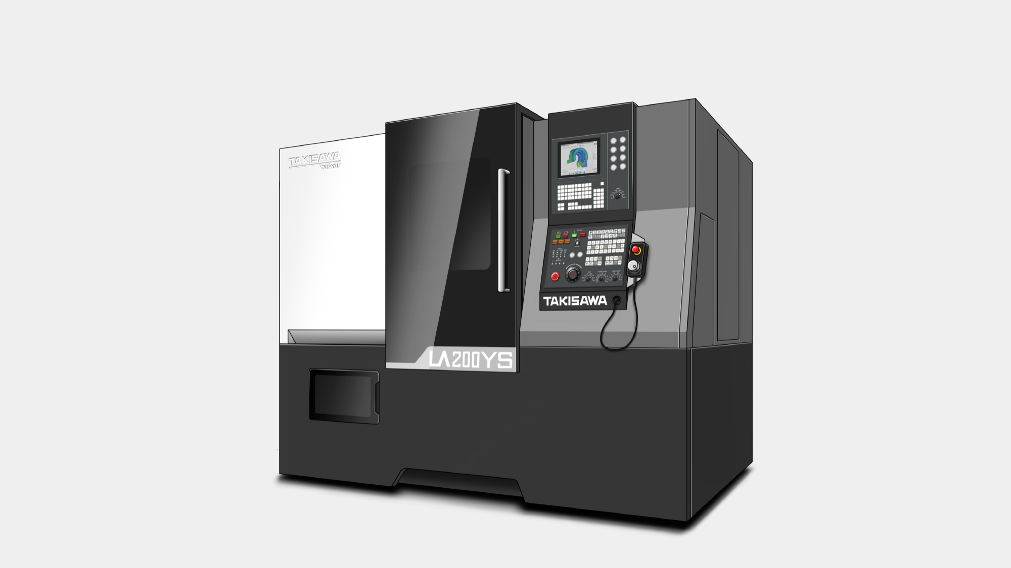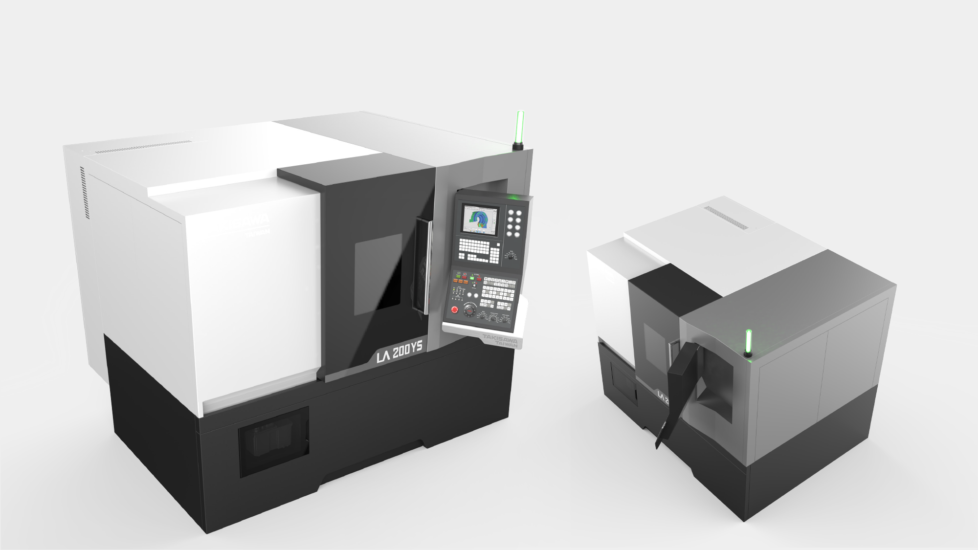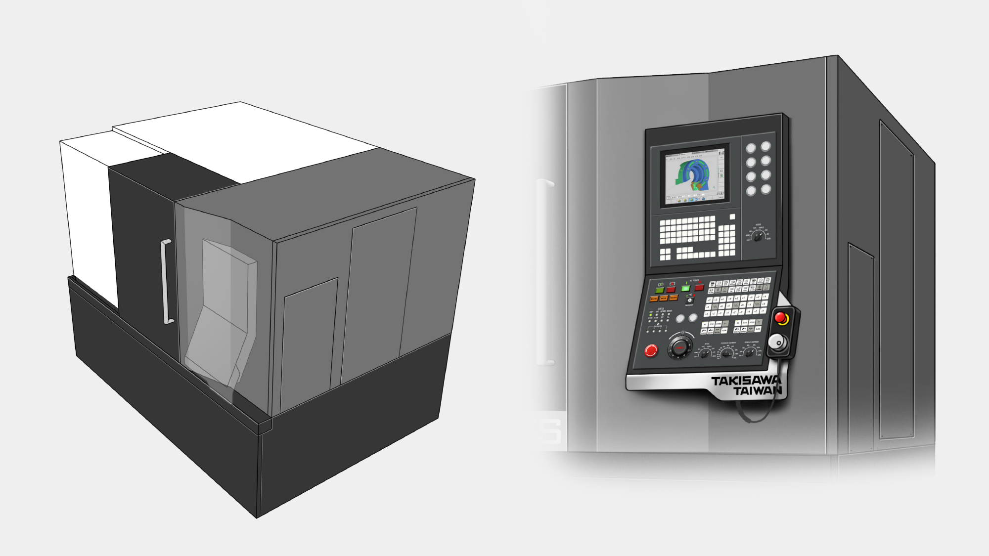 本專案旨在為台灣瀧澤 NX2000 建立具備國際競爭力的視覺高度。首要目標在於實踐「簡潔大方」的外觀風格,並透過板金設計區分高低階機種的差異化。在人機互動層面,核心挑戰在於優化懸臂形式操作箱,確保其在旋轉過程與雙向使用下,完全不會阻礙使用者進行工件上下料的動線空間。我們力求在嚴苛的切削環境中,建構一個安全、直覺且具備數位秩序的專業加工場域。