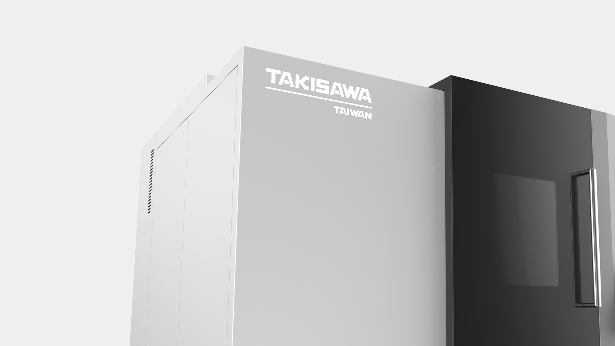 徹底翻轉視覺邏輯,將板金折線改為「橫向延伸」,並與操作箱面板斜度達成視覺上的平行對位。工作門延伸至軌道下方,搭配全滿版壓克力設計,整體視覺呈現出極具震撼力的「大氣」感,展現高階機種的性能卓越。