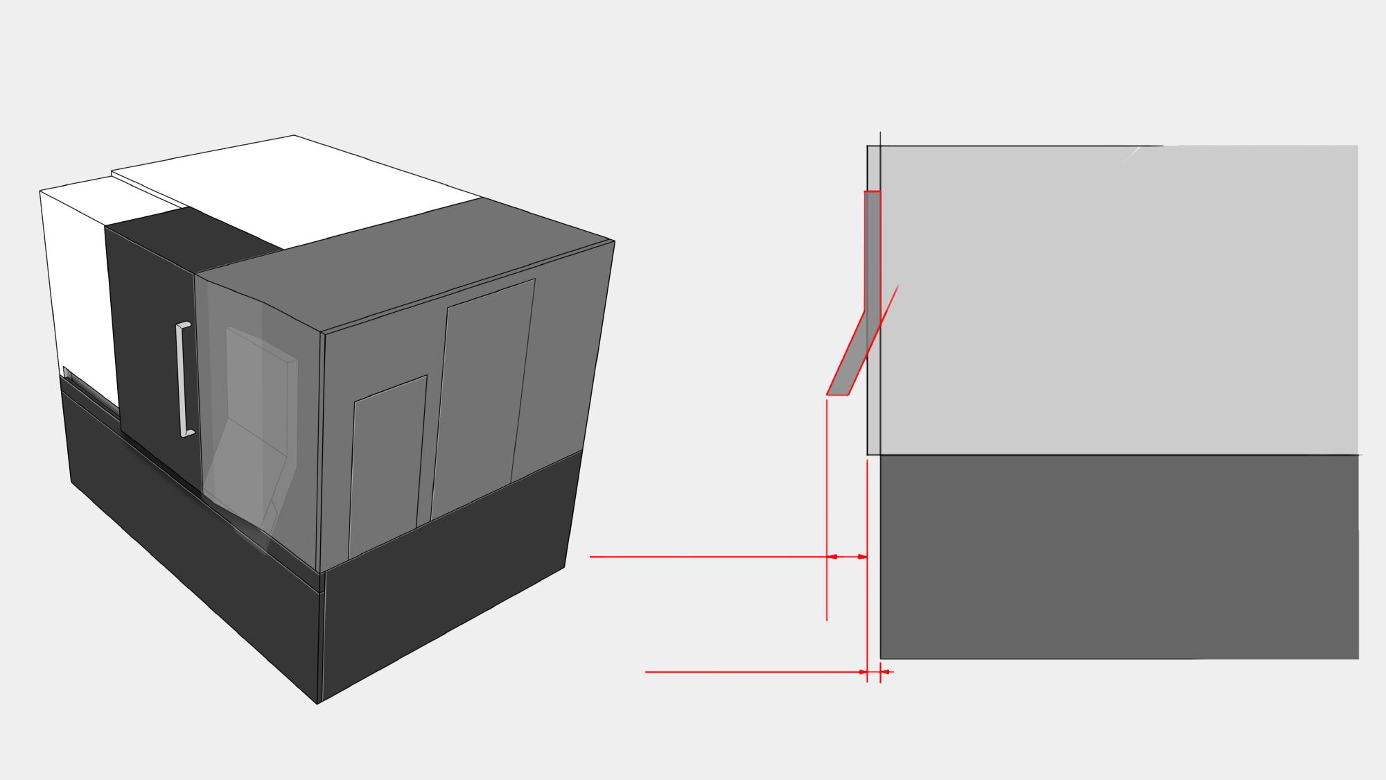 面對大型機台普遍存在的部件雜亂感,形碩設計採取「幾何簡約化」策略,旨在實現戴總經理要求的「簡潔大方」風格。我們重新審視 懸臂式操作箱 與 雙滑門 的互動關係,透過提高視覺腰線、內縮量體或橫向線條延伸,解決懸臂支臂可能干涉上下料空間的痛點。在維持白、灰、黑三主色的專業基調下,藉由壓克力視窗的配置方式,在「最大化可視範圍」與「品牌視覺識別」間取得完美平衡。