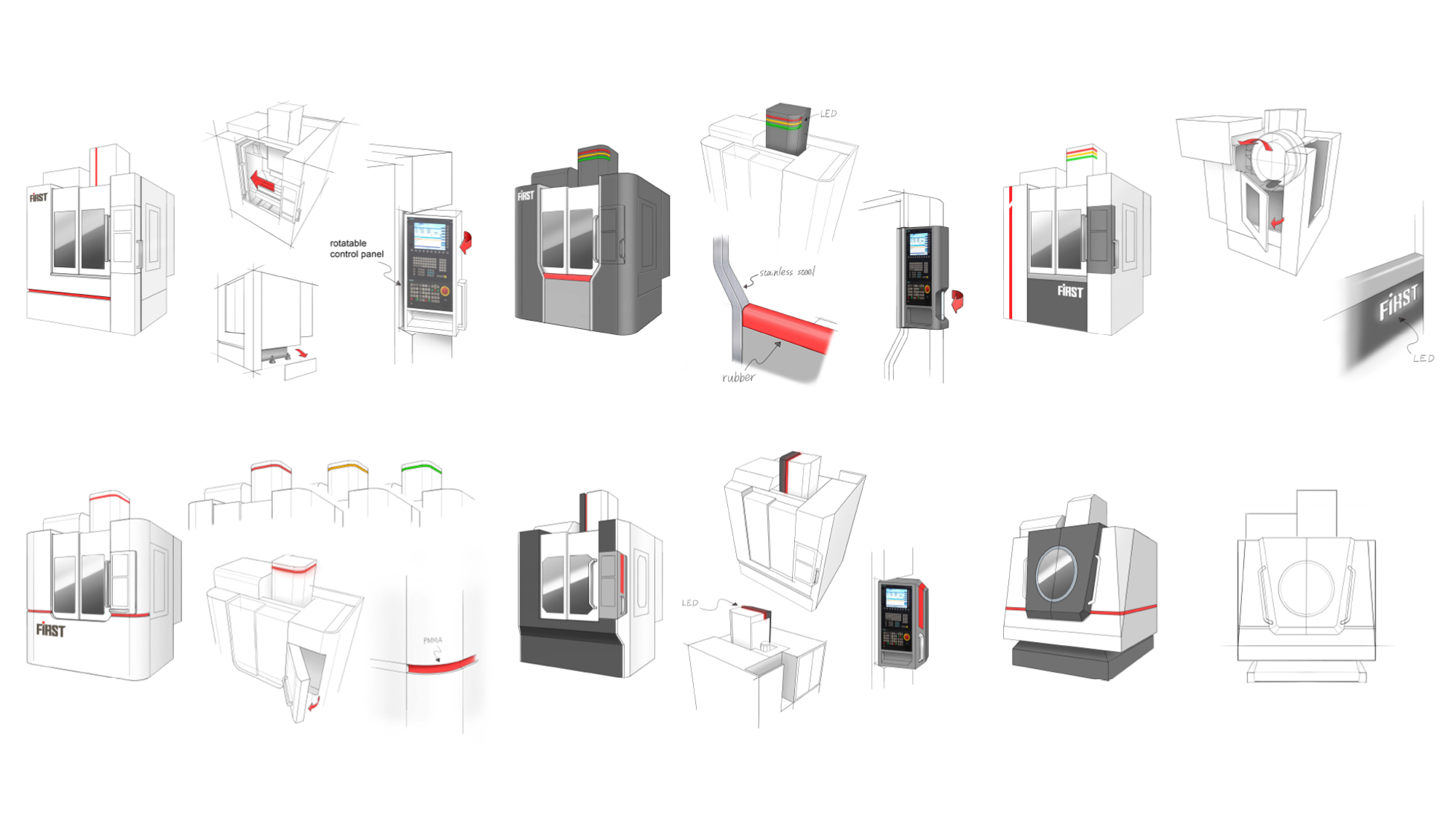 針對龍昌機械 V700 綜合加工機的標準型定位,形碩設計提出了六款各具特色的造型提案。我們在維持量產成本優勢的前提下,透過幾何線條的轉化、色彩塊面的對比以及創新材質的運用,將「高速、高轉速」的性能特徵轉化為具備國際競爭力的視覺語彙。這些提案不僅解決了標準機種容易缺乏質感的問題,更精確導入了訪談中提到的「高低差層次感」與「精緻點綴」的設計核心。