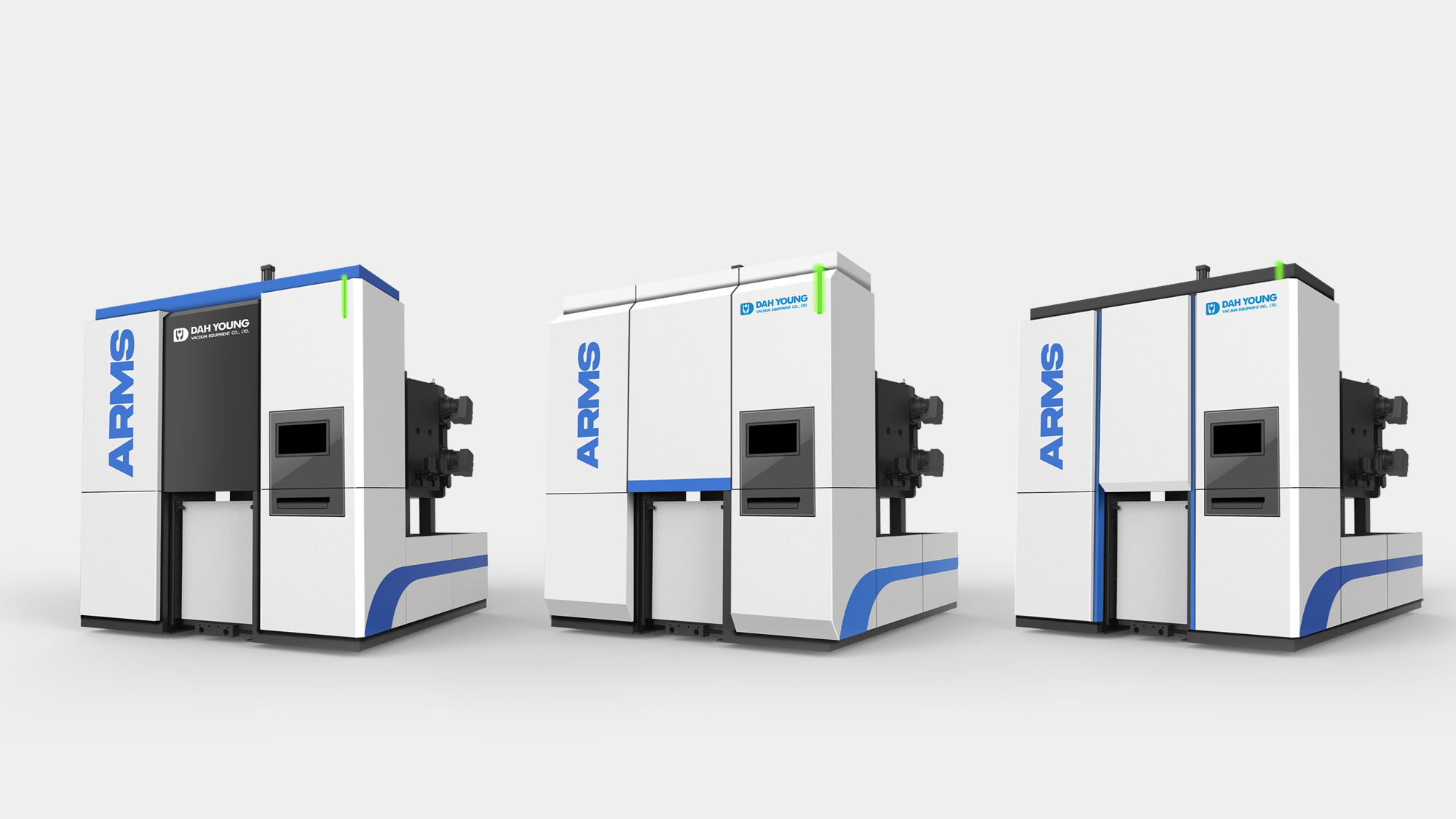形碩設計以「品牌識別度」與「量產工藝平衡」為核心,針對 ARMS 系列發展出三組截然不同的視覺策略。我們致力於在龐大的真空腔體結構中,透過水平與垂直的幾何轉構,消弭重工業設備的壓迫感。藉由藍色識別色帶的精準介入,不僅解決了多板件拼接的視覺瑣碎問題,更透過外罩設計修飾內部機構高度,建立起一套符合大永真空「精密、穩定、領先」品牌形象的家族設計準則。