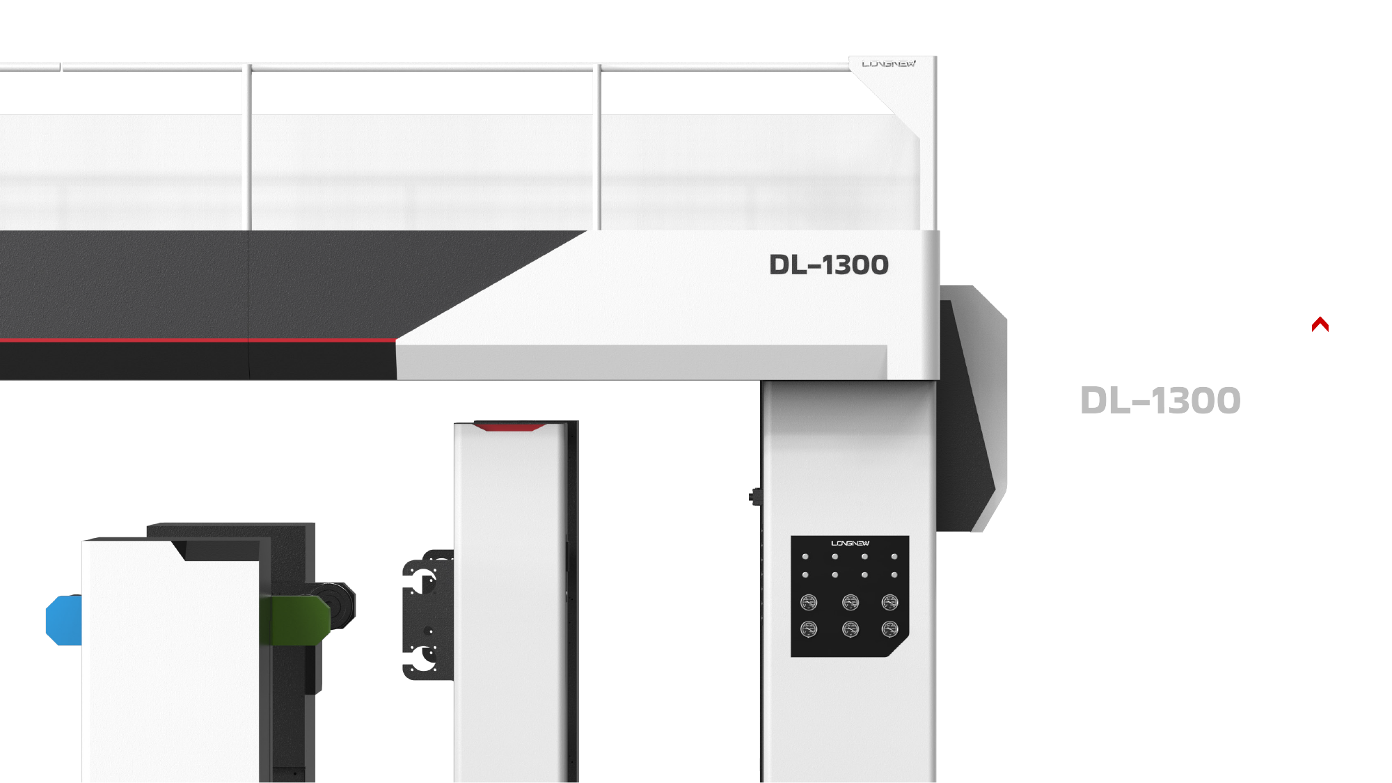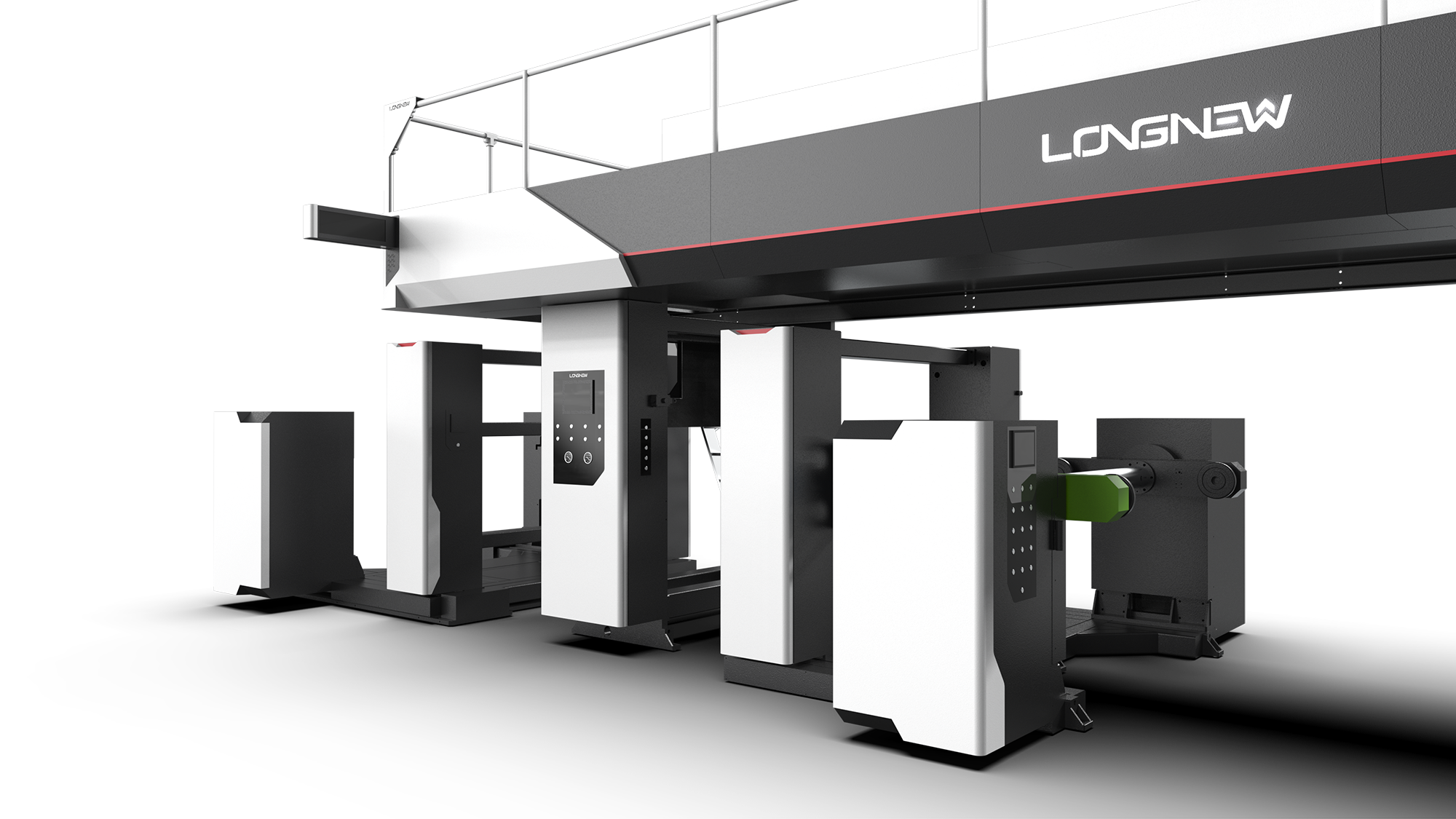 線條語彙修飾: 導入「斜線速度感」設計,並在深灰色區域點綴紅色線條,提升機台的動態視覺表現。欄杆邊緣特別設計了專屬飾板進行包覆,消弭了傳統工廠欄杆的生硬感。