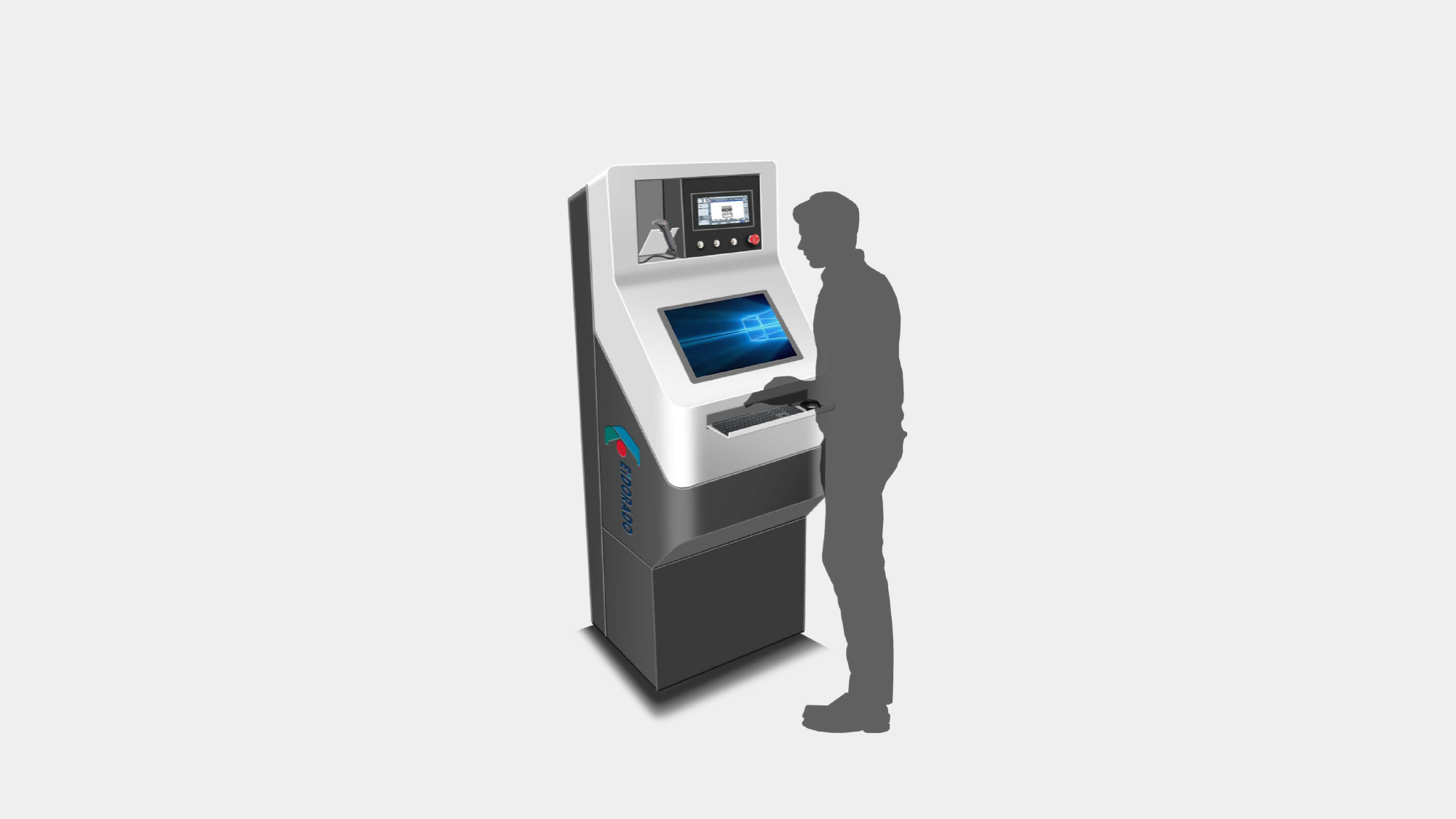 獨立工作站 :工作站兩側採壓克力側板呼應本體造型,並規劃專屬凹槽整合鍵盤與條碼機,維持作業區域的整潔秩序 。