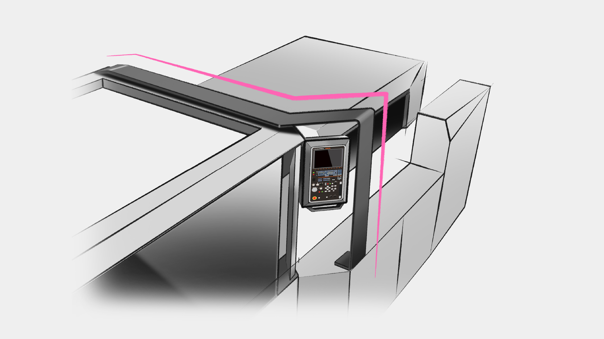 機能美學整合:將電氣箱與主機身連為一體,利用深度落差創造包圍感,上方懸浮保護桿與電氣箱斜角平行,有效消弭重型設備的厚重感。