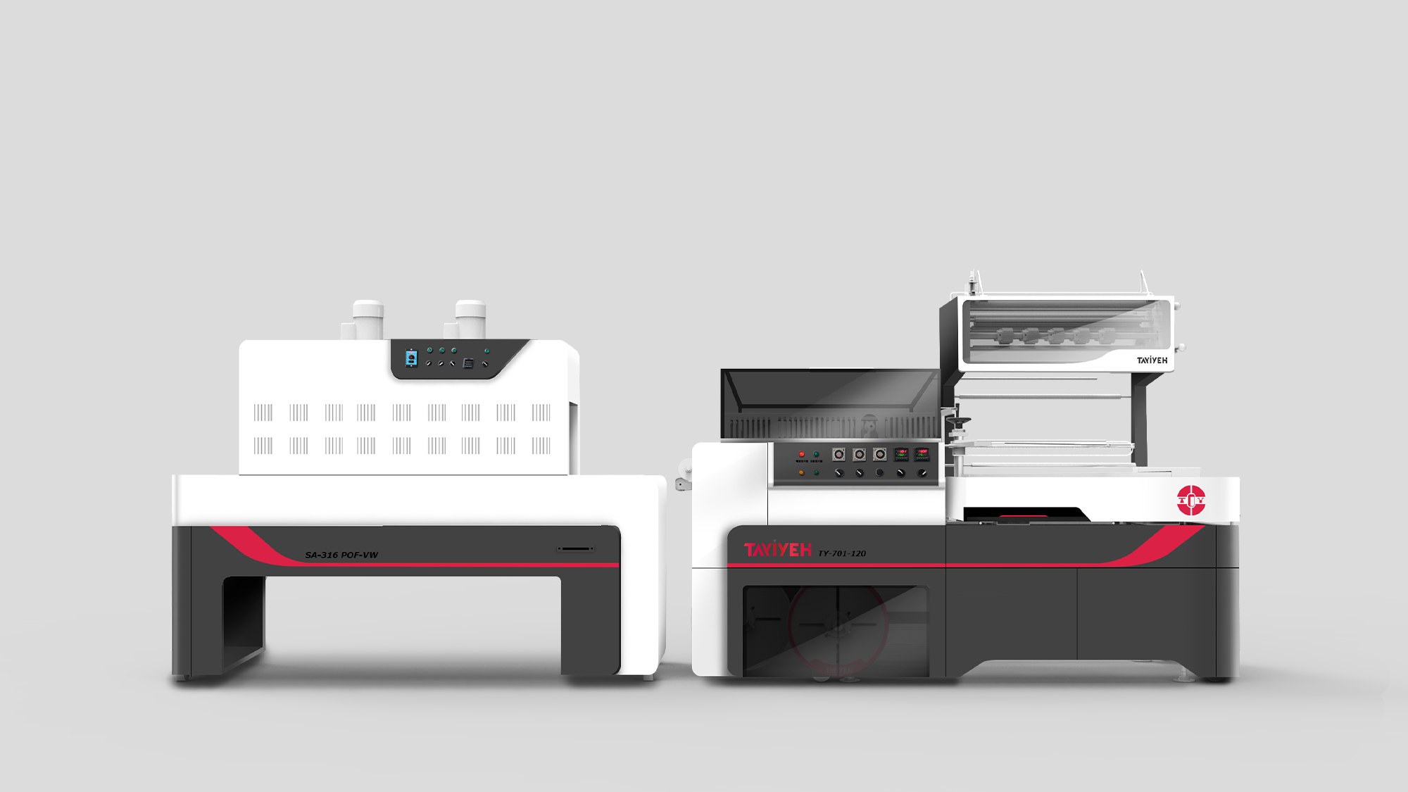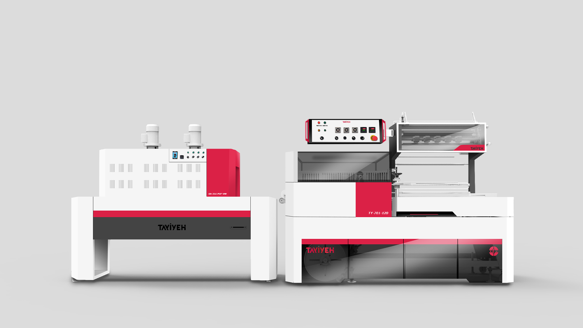 視覺連貫意象:紅色曲線色帶從封口機一路連貫至收縮機,呼應「膠膜捲動」的意象,有效指引正確的換膜順路。
