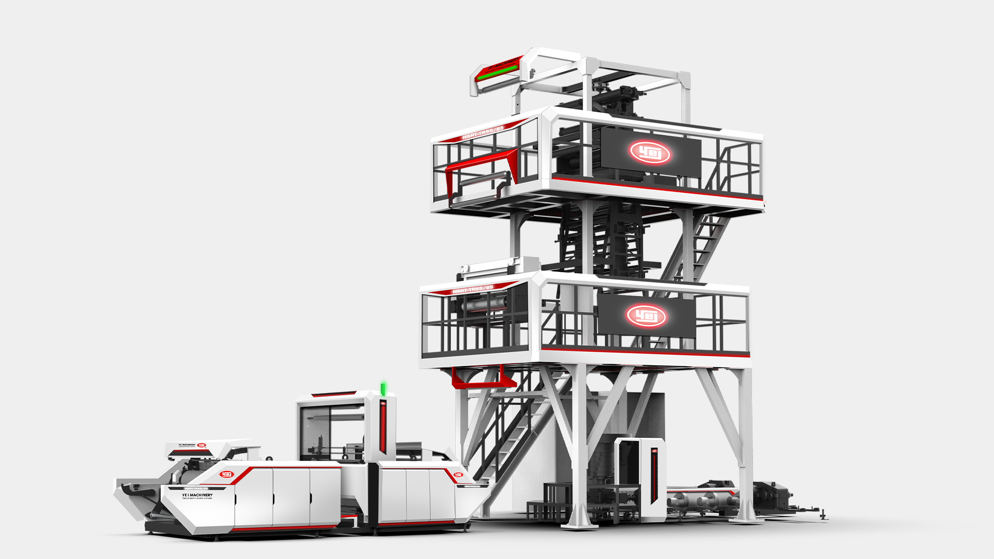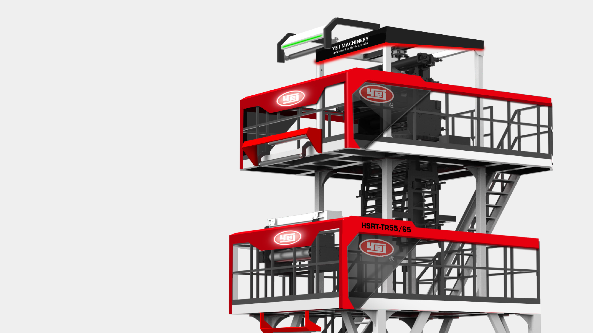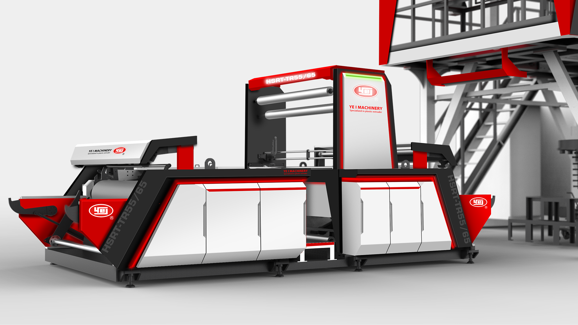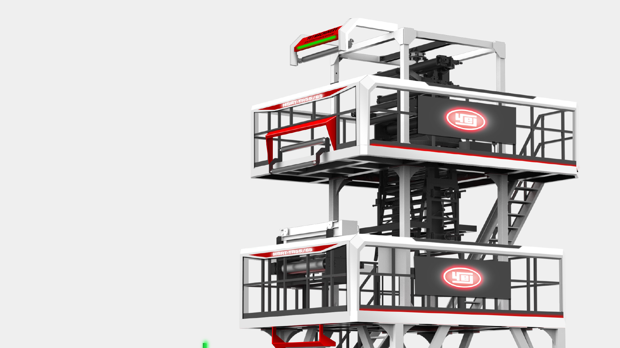 性能視覺化:利用紅、灰、白三色鈑金層次交疊,搭配紅色燈條營造吹膜機的高效率動能意象。
