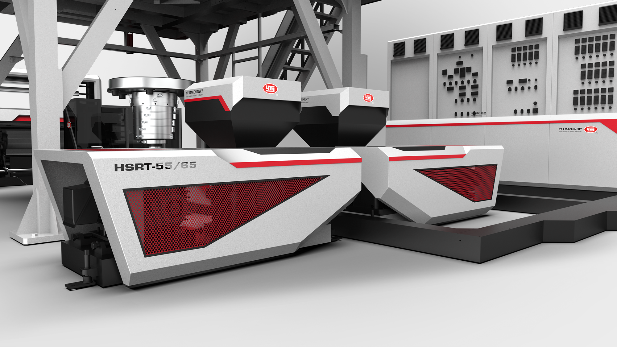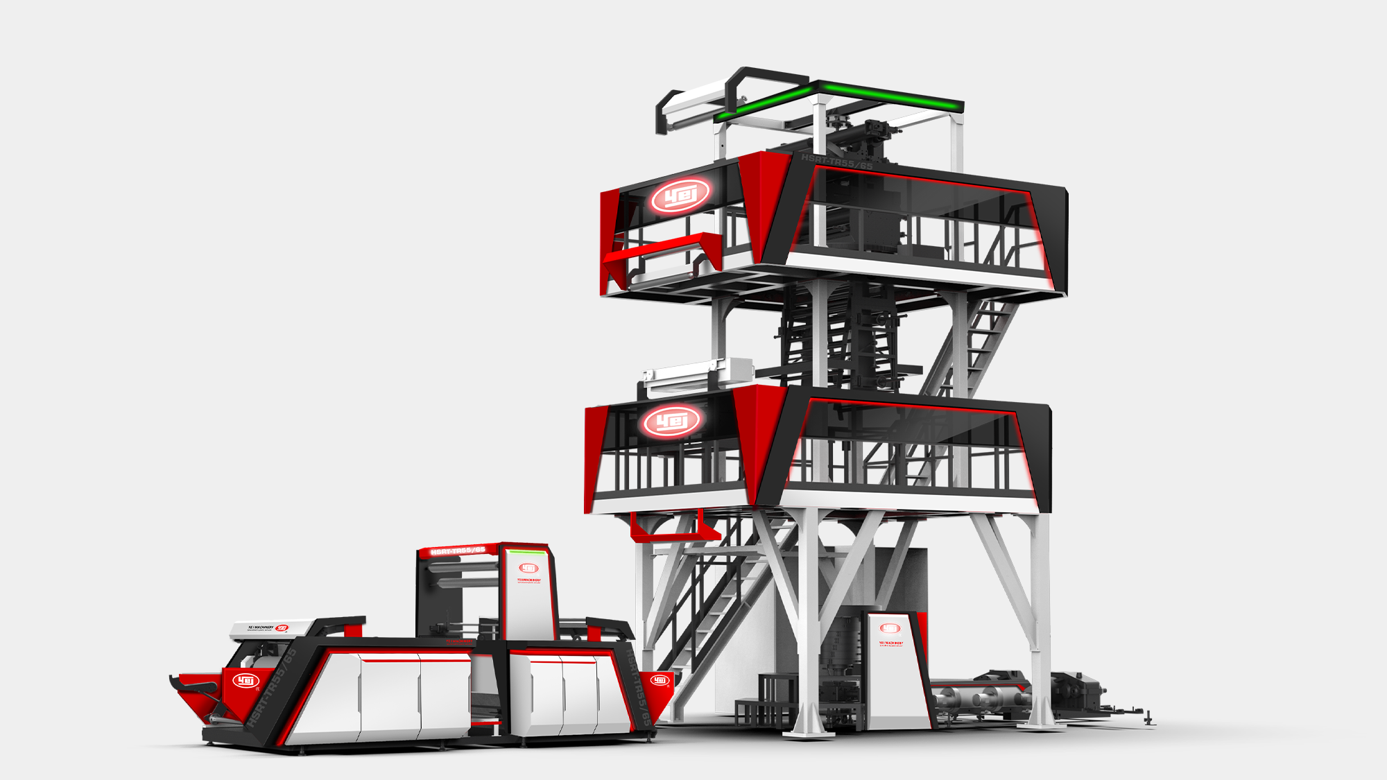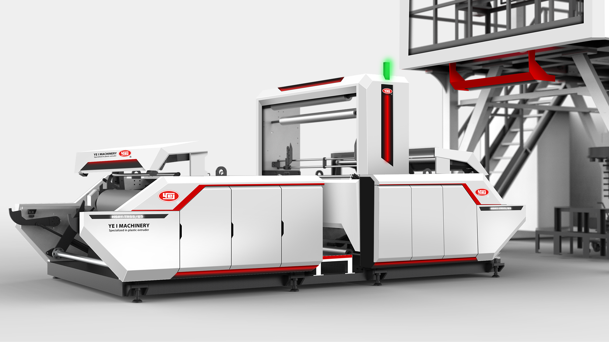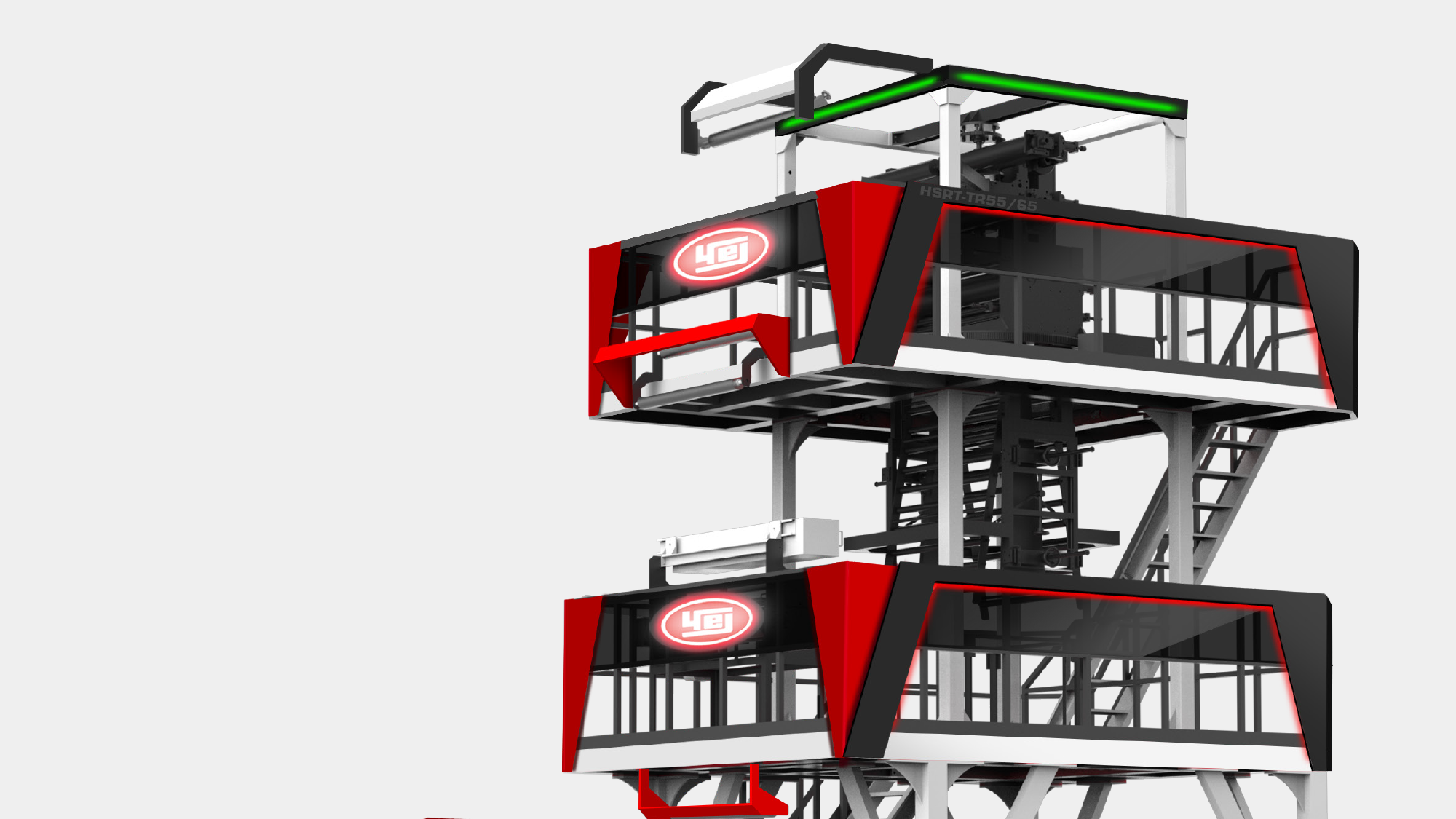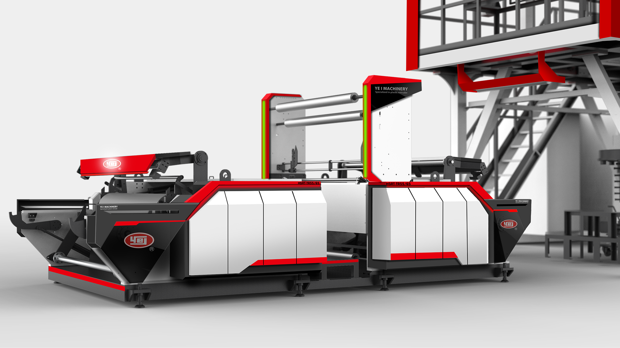 性能視覺化:利用紅、灰、白三色鈑金層次交疊,搭配紅色燈條營造吹膜機的高效率動能意象。
