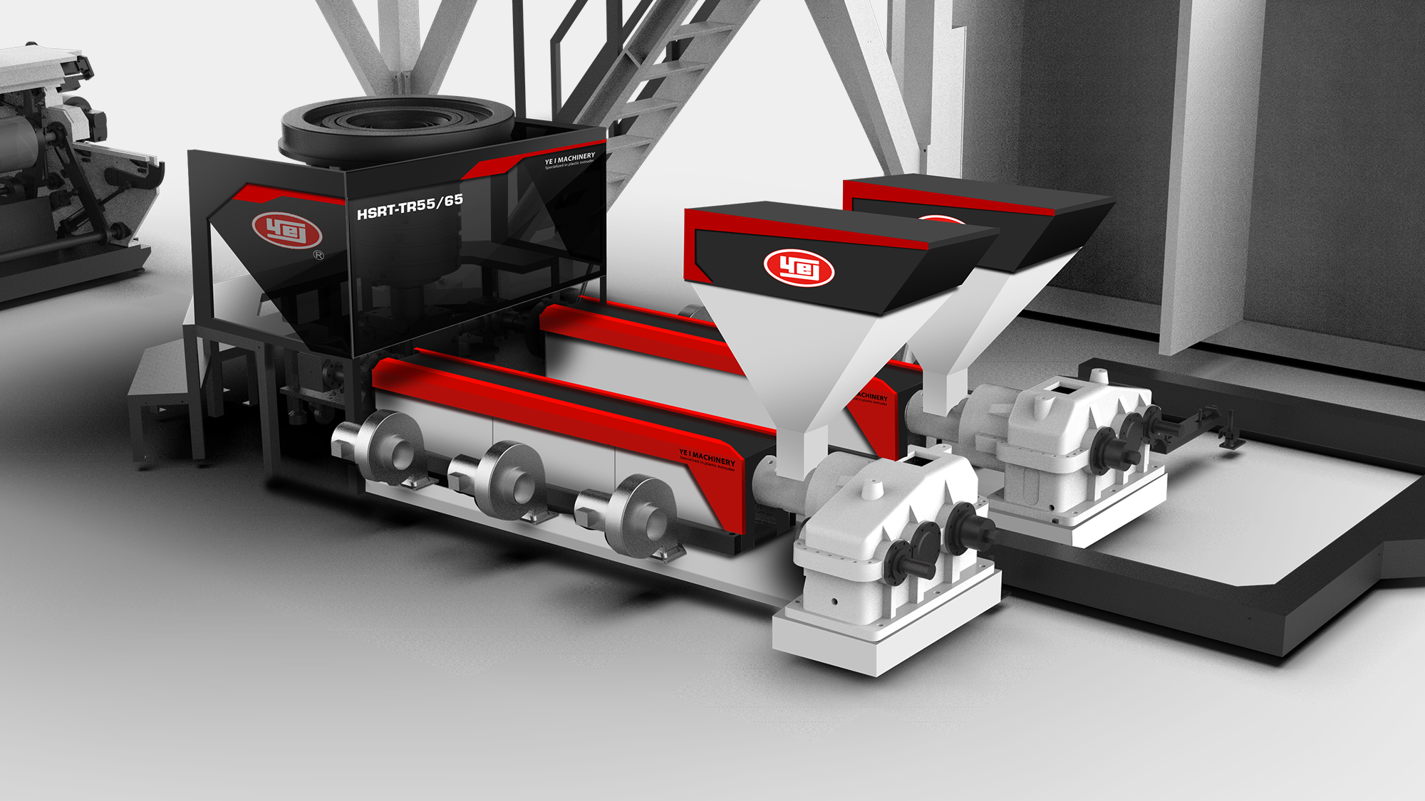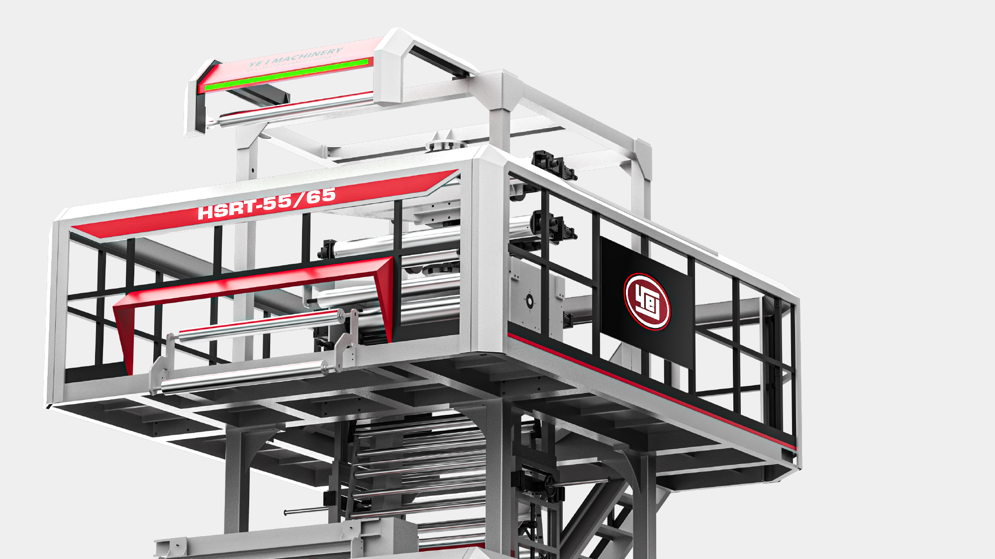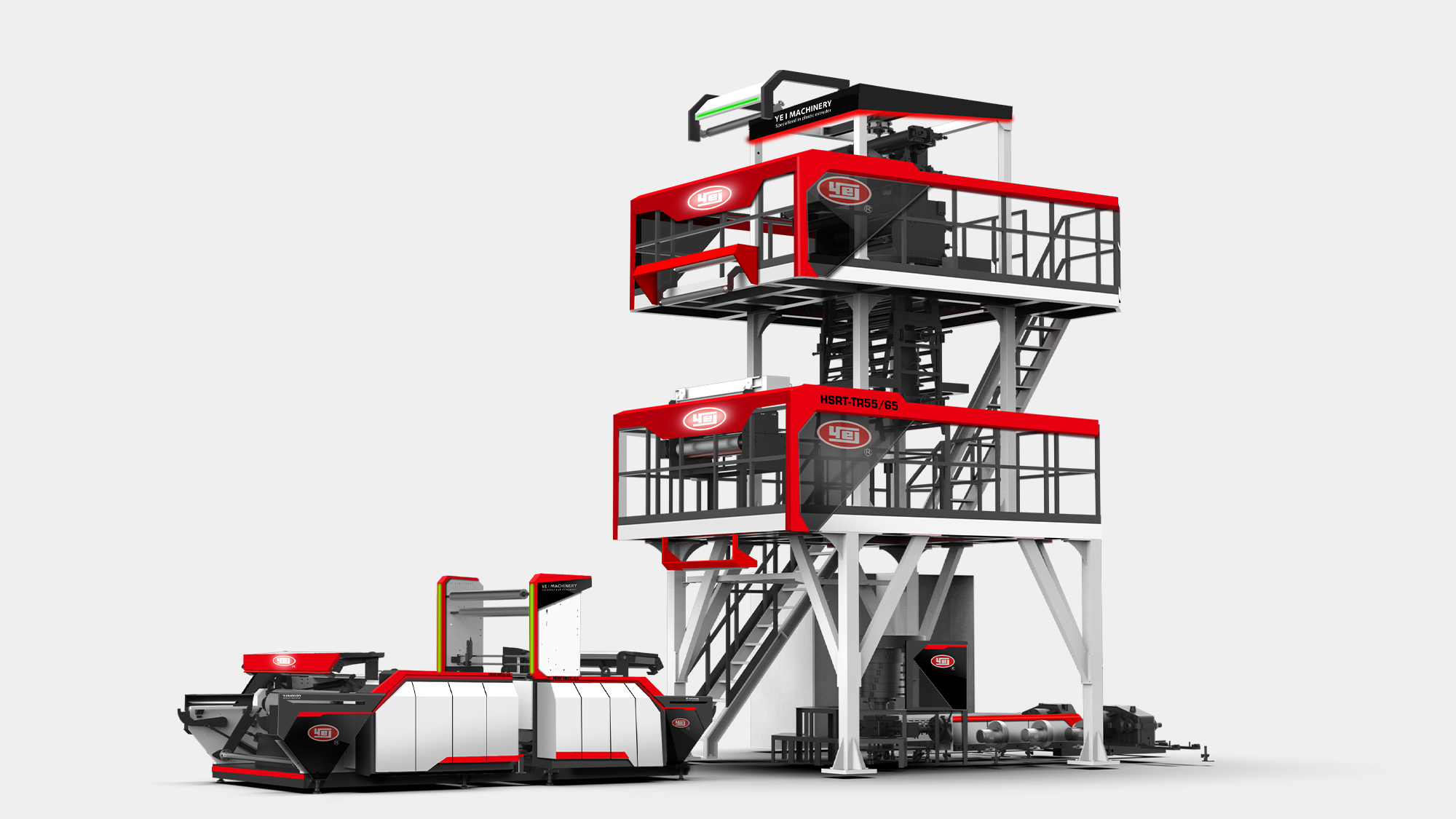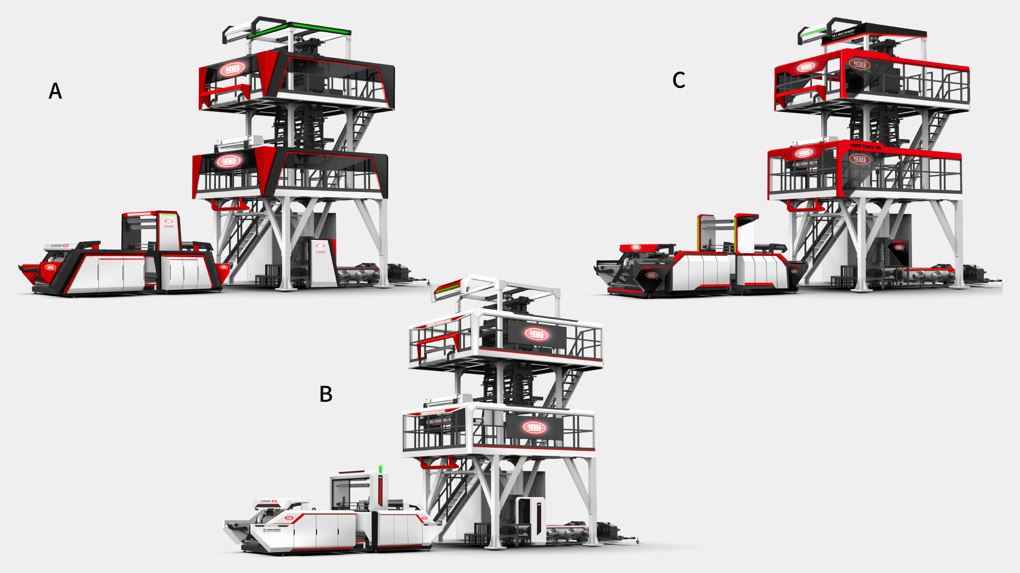 性能視覺化:利用紅、灰、白三色鈑金層次交疊,搭配紅色燈條營造吹膜機的高效率動能意象。