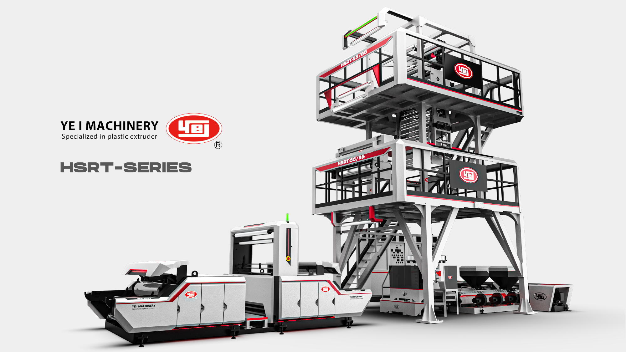 高效率語彙:延續紅色速度感線條設計,精準傳達吹膜機在極速產能下的動能表現。