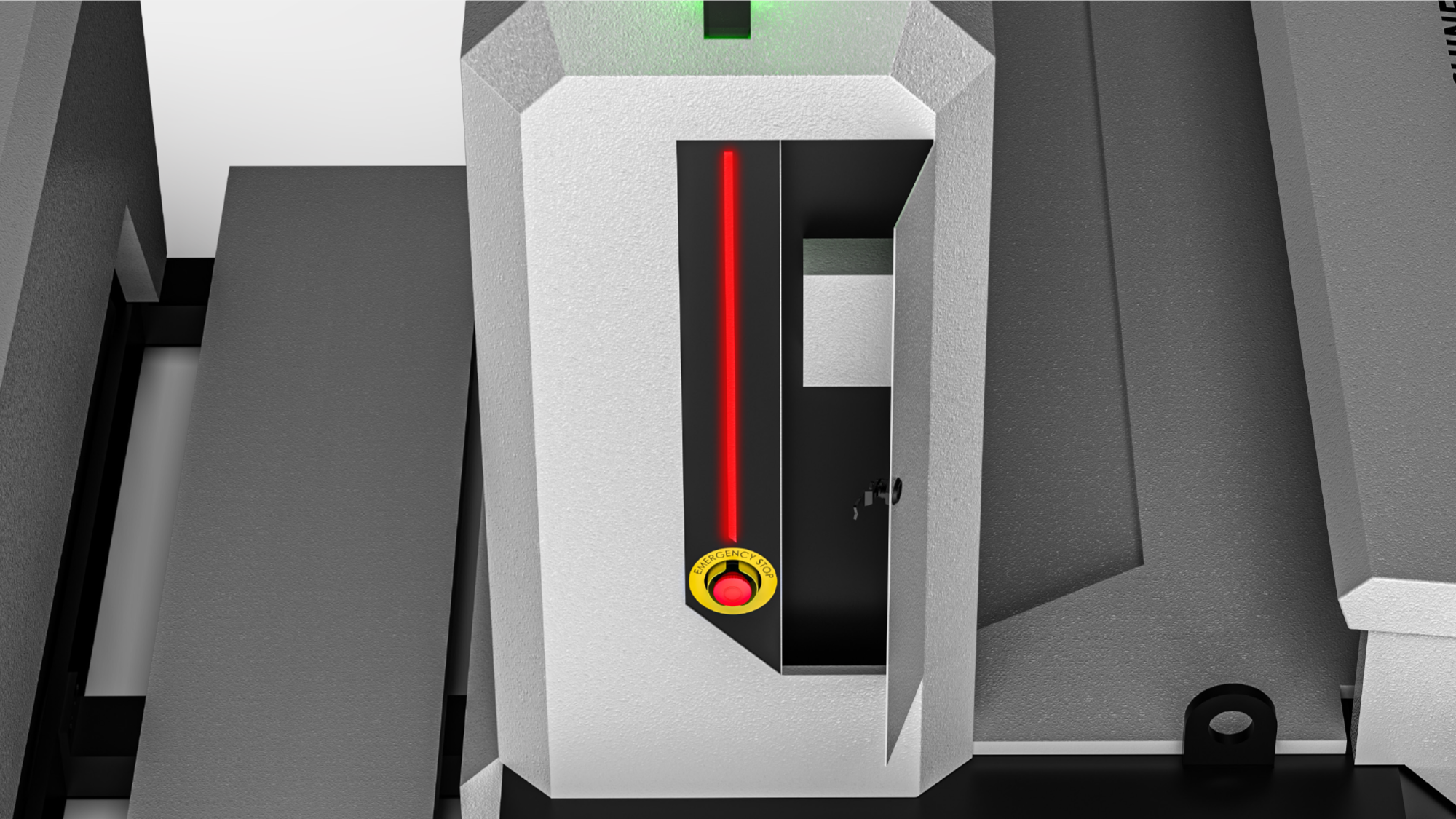 辨識效率提升:採用置頂式警示燈設計,大幅強化在廠房遠端的狀況辨識度。發亮形式設計的 LOGO 與多折角造型相輔相成,讓高產能機種展現高品質的工業美學。