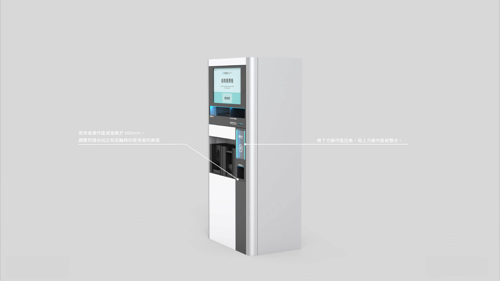 為應對不同使用情境,並將無障礙客群納入設計考量,我們重新定義了設備的操作介面。將所有操作功能整合在壓克力面板上,並將其提升至符合人體工學的適當高度。