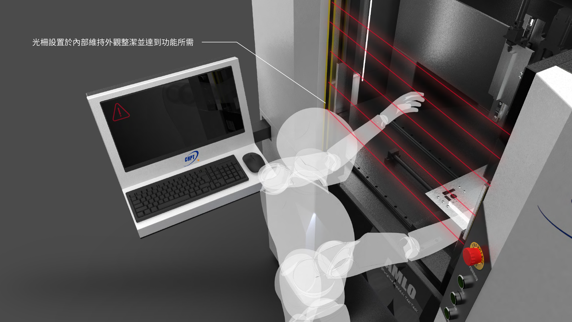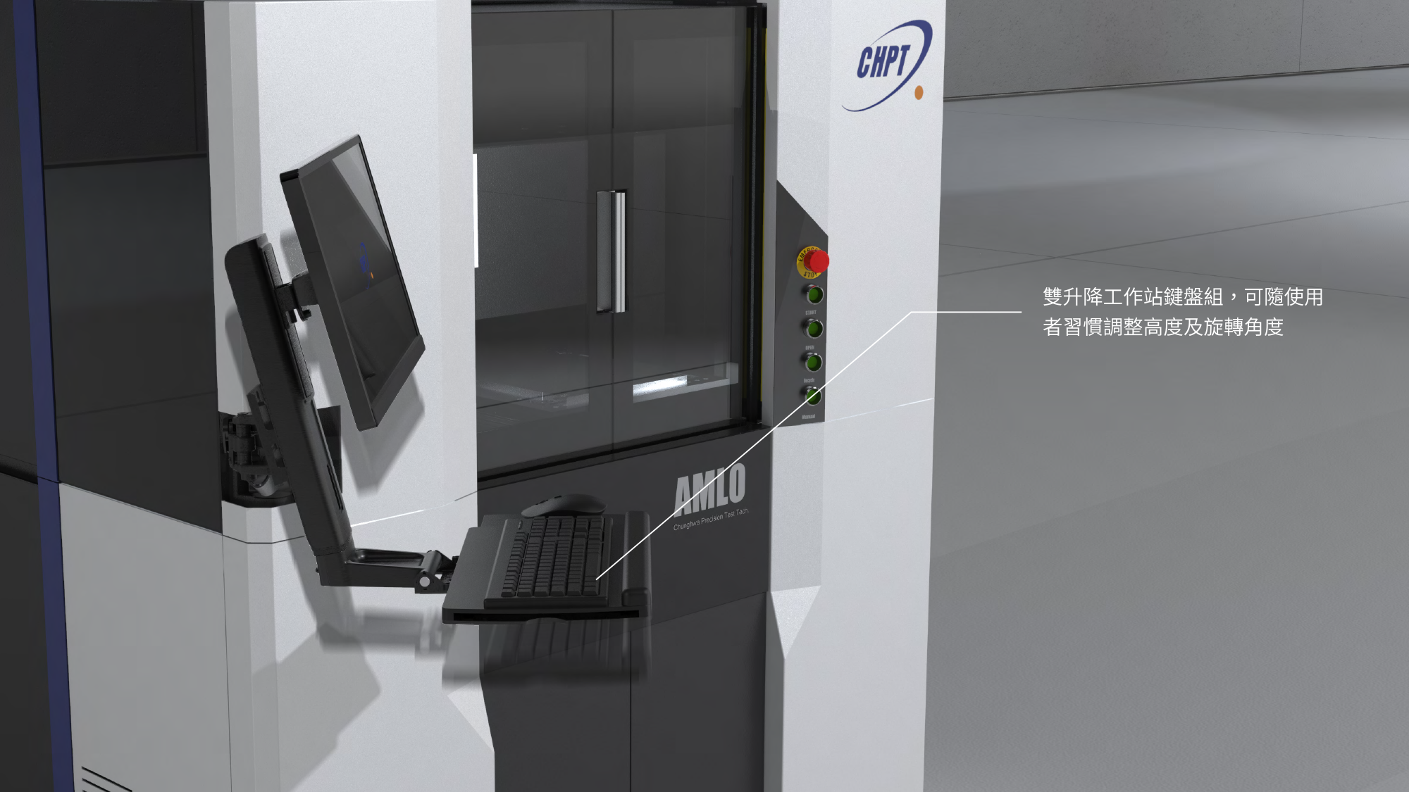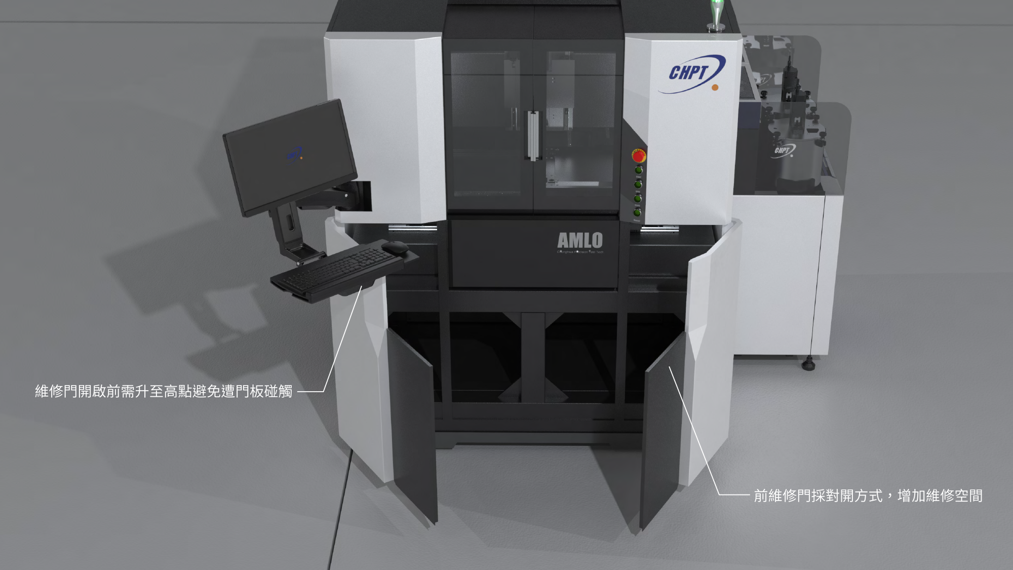 在半導體測試設備的高階研磨領域中,設備的穩定性與安全性是核心關鍵 。形碩設計針對中華精測 AMLO 精密研磨機,深入分析操作人員的感知疲勞問題,優化了正面鍵盤與螢幕的操作區配置 。我們解決了傳統氣動門可能帶來的夾手風險,透過加裝安全光柵與預留腳踢空間,將安全防護提升至國際標準 。這不僅是一台研磨設備的轉型,更是對生產效率與勞動安全的高度承諾 。