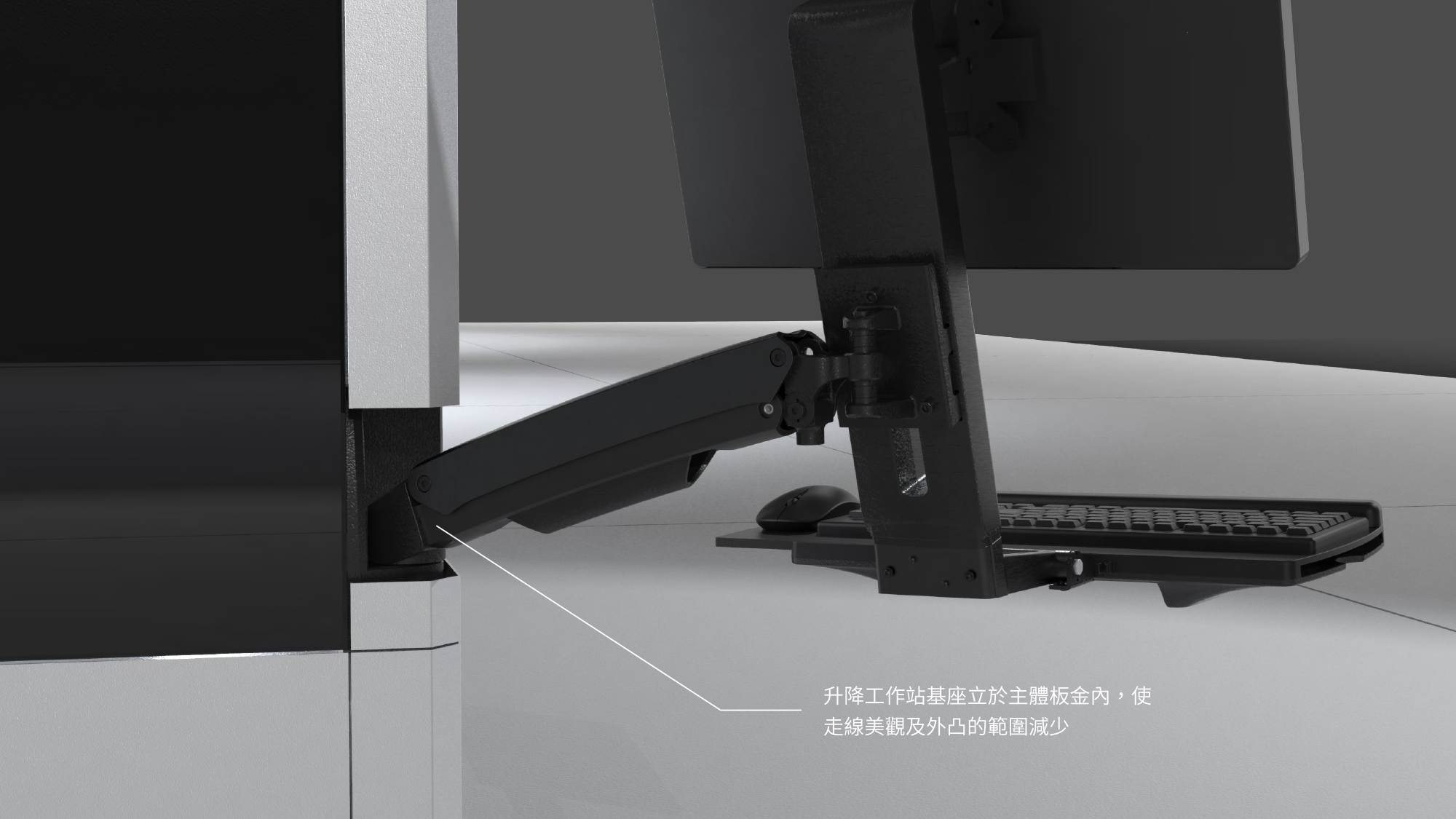 將升降工作站基座立於主體板金內部,大幅減少外部突起範圍,並實現線材隱藏式設計,確保廠區視覺美觀。