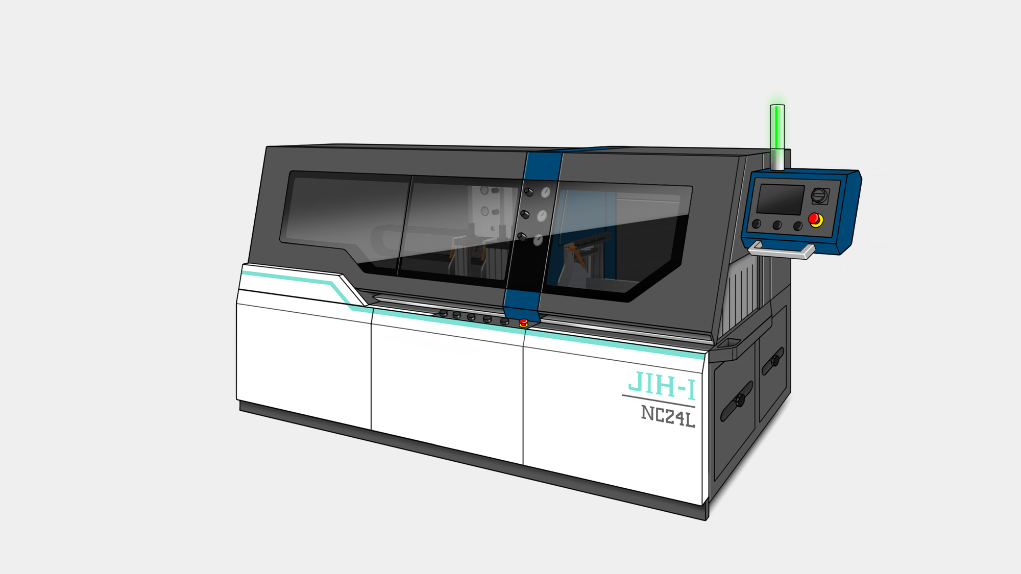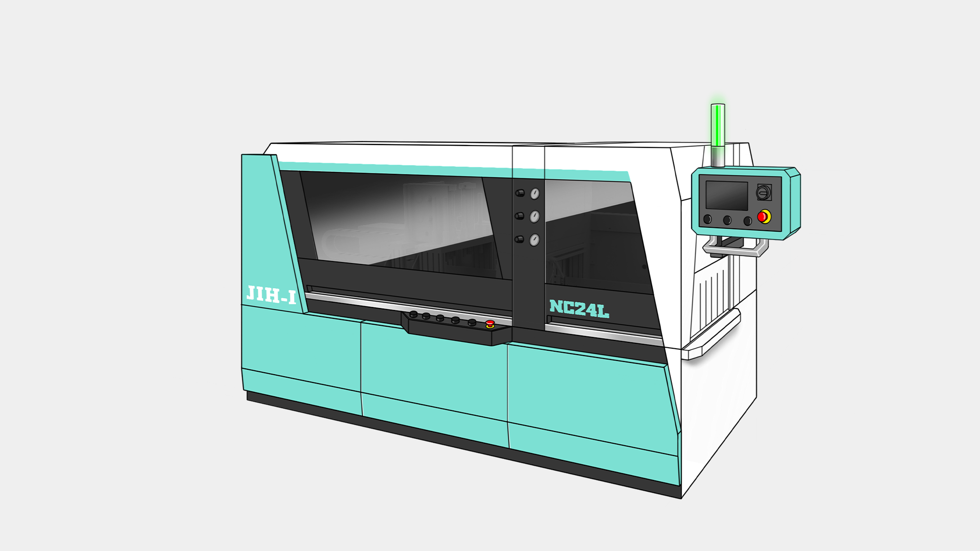 日意機械 NC24L 以「精度穩定」與「加工面精細」聞名。本次設計的核心挑戰在於如何落實企業高度客製化的特性,同時在「有防護罩」與「無防護罩」兩種版本間實現高度零件共用性。形碩設計透過「方正穩重」的下半部幾何設計,賦予機台強大的穩定感知,並利用視覺引導解決頻繁的維修與操作需求。這不僅是一次外觀的翻新,更是對「加工效率」與「品牌彈性」的深度結構優化。