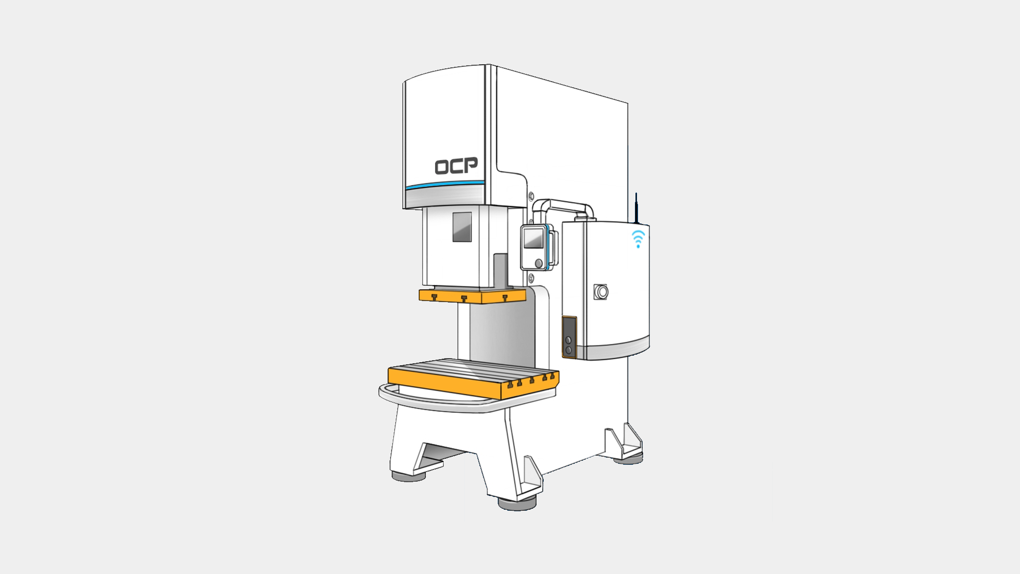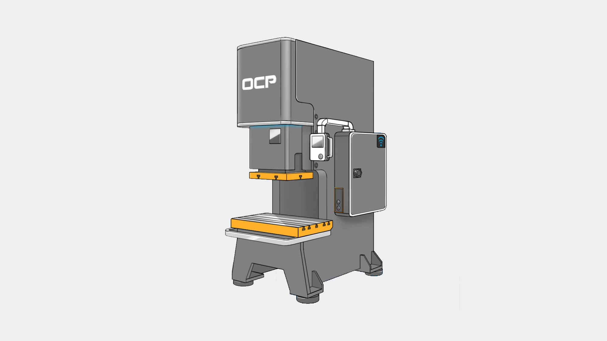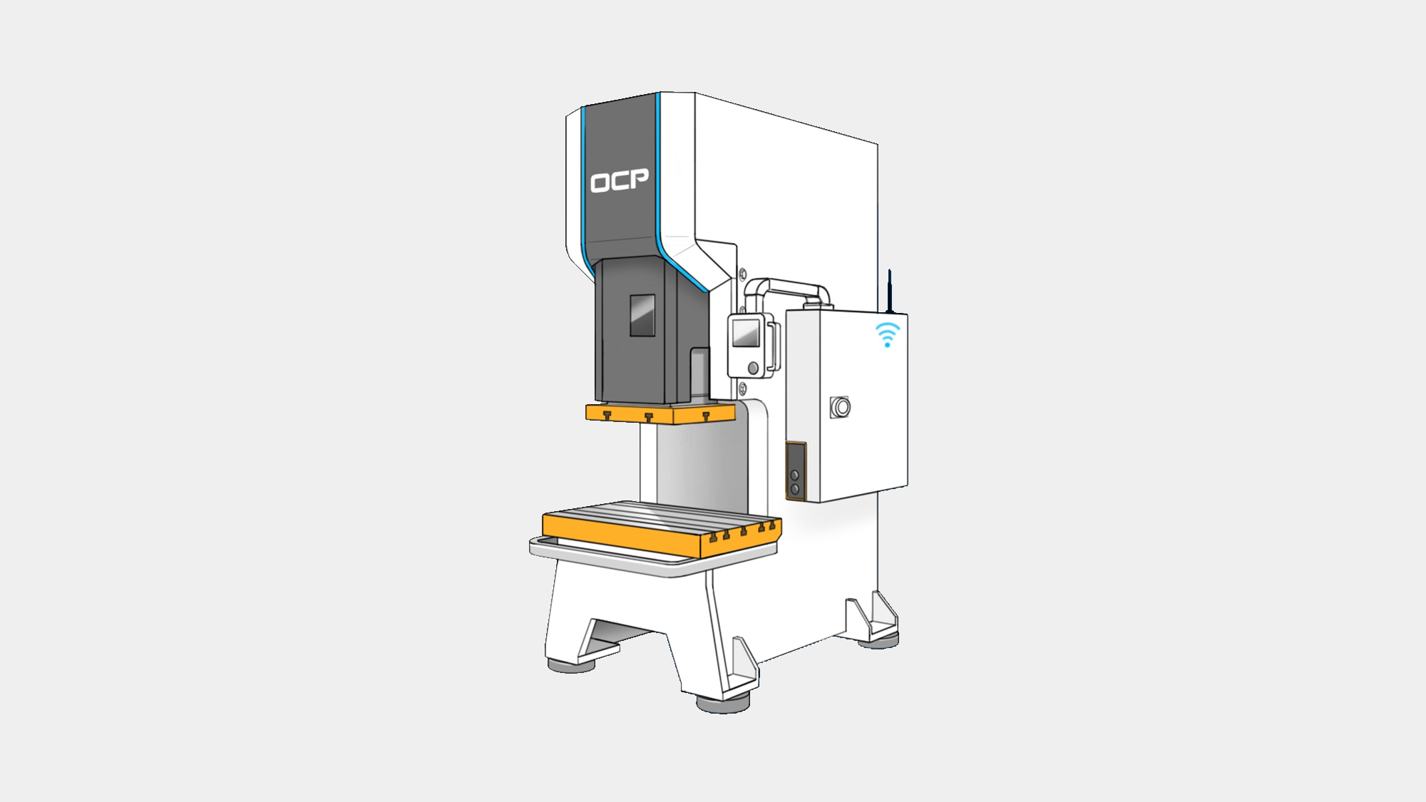 在金豐 OCP 專案中,形碩針對訪談中所提到的「穩重感」、「智慧化」與「未來感」等核心需求,提出五款風格的造型提案。我們試圖打破傳統沖床笨重、粗糙的既定印象,透過板金摺線、異材質結合以及 LED 燈光工程,將 OCP 汎用型沖床重新定義為具備高科技質感的智慧生產終端。