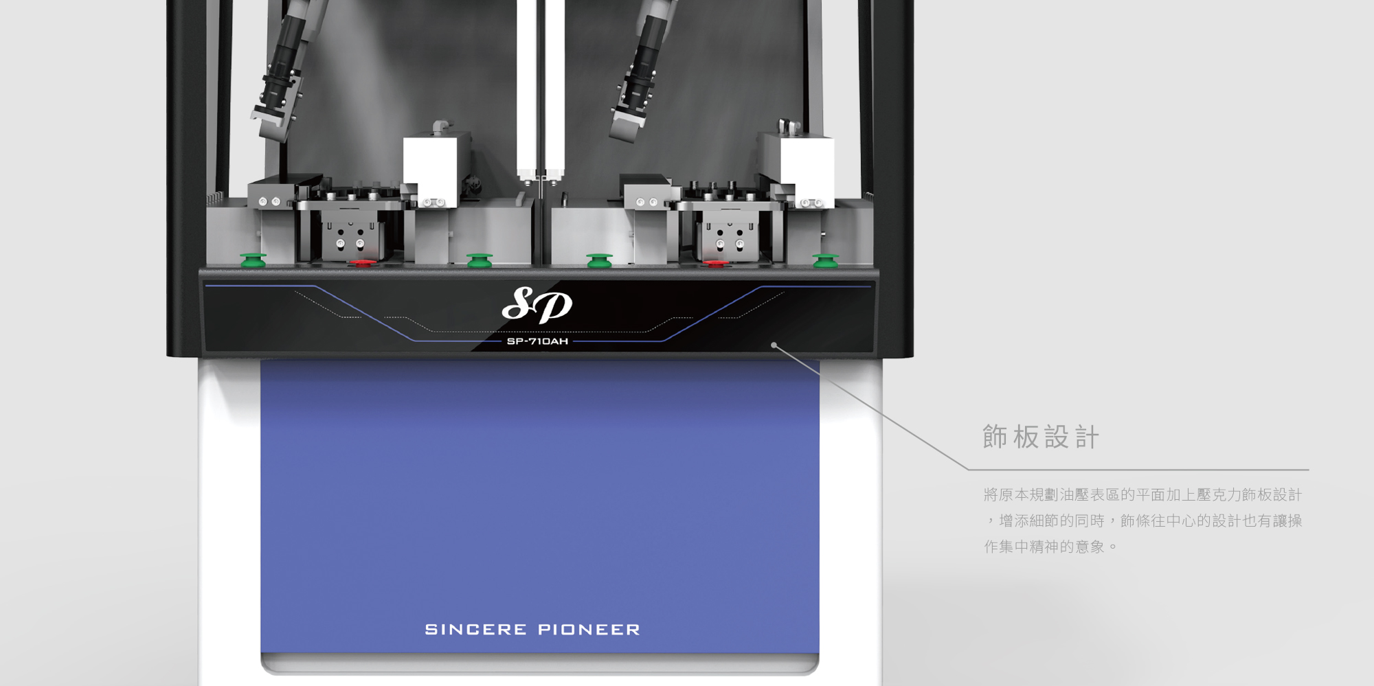 這是第一次與誠鋒合作,同時也是我形碩第一次接觸製鞋類的機種。形碩的任務是重塑造型外觀,因現有的SP-710AH與市面上相同的機型造型都較陽春,且機構外觀都較為細碎,首先須保留正確的操作邏輯,另外最重要的就是將現有的機構重新包裝外型,賦予它全新的造型風格,在競品市場中獨樹一格。