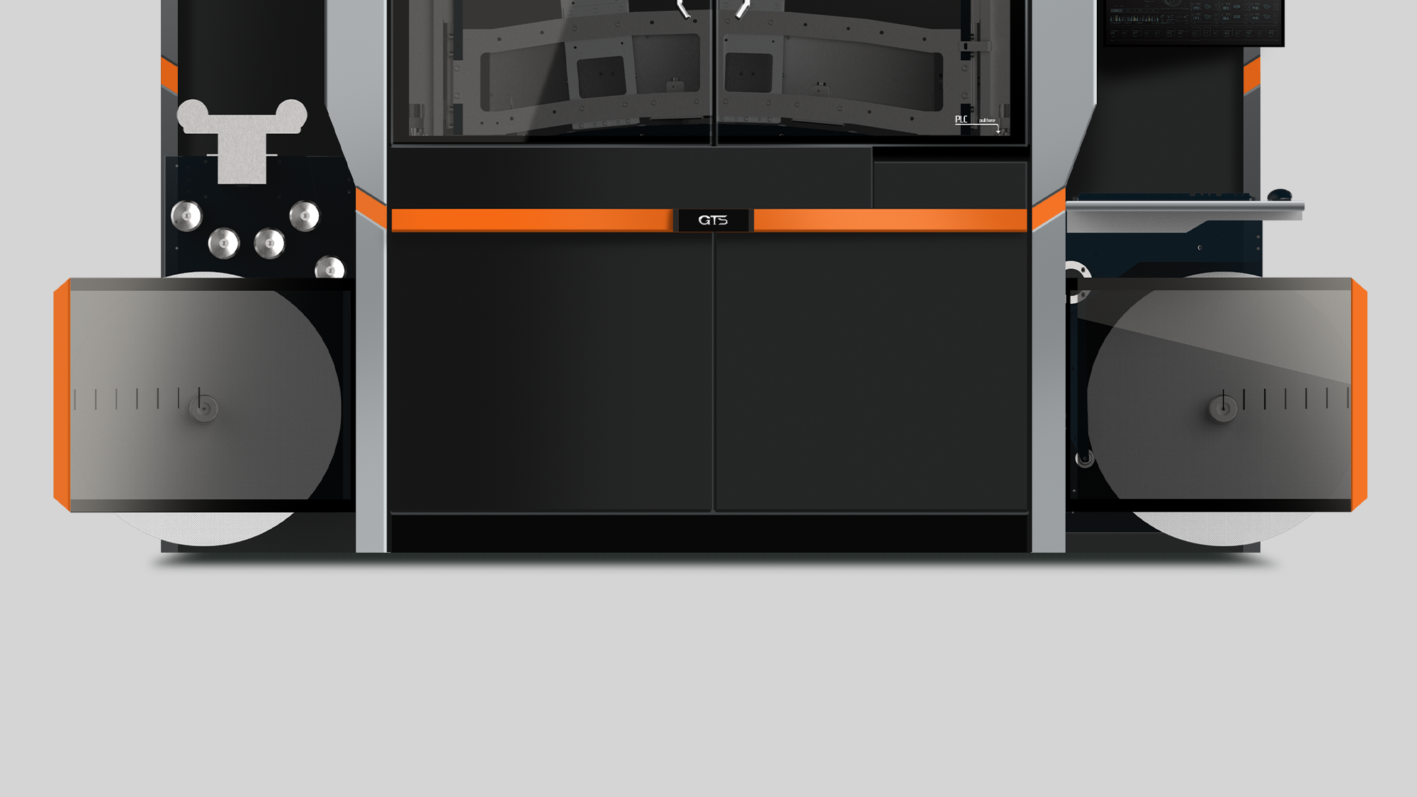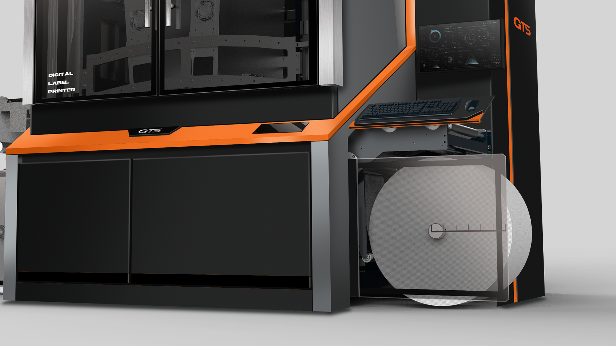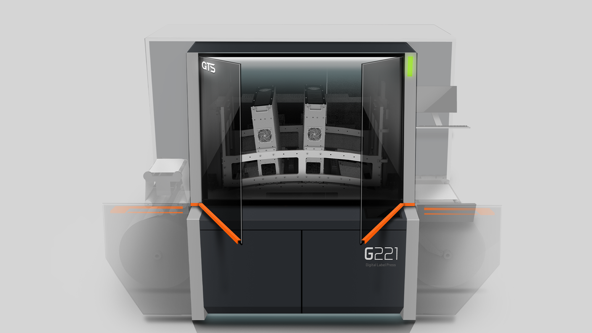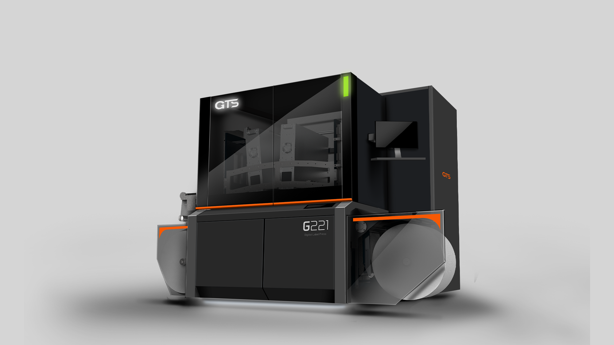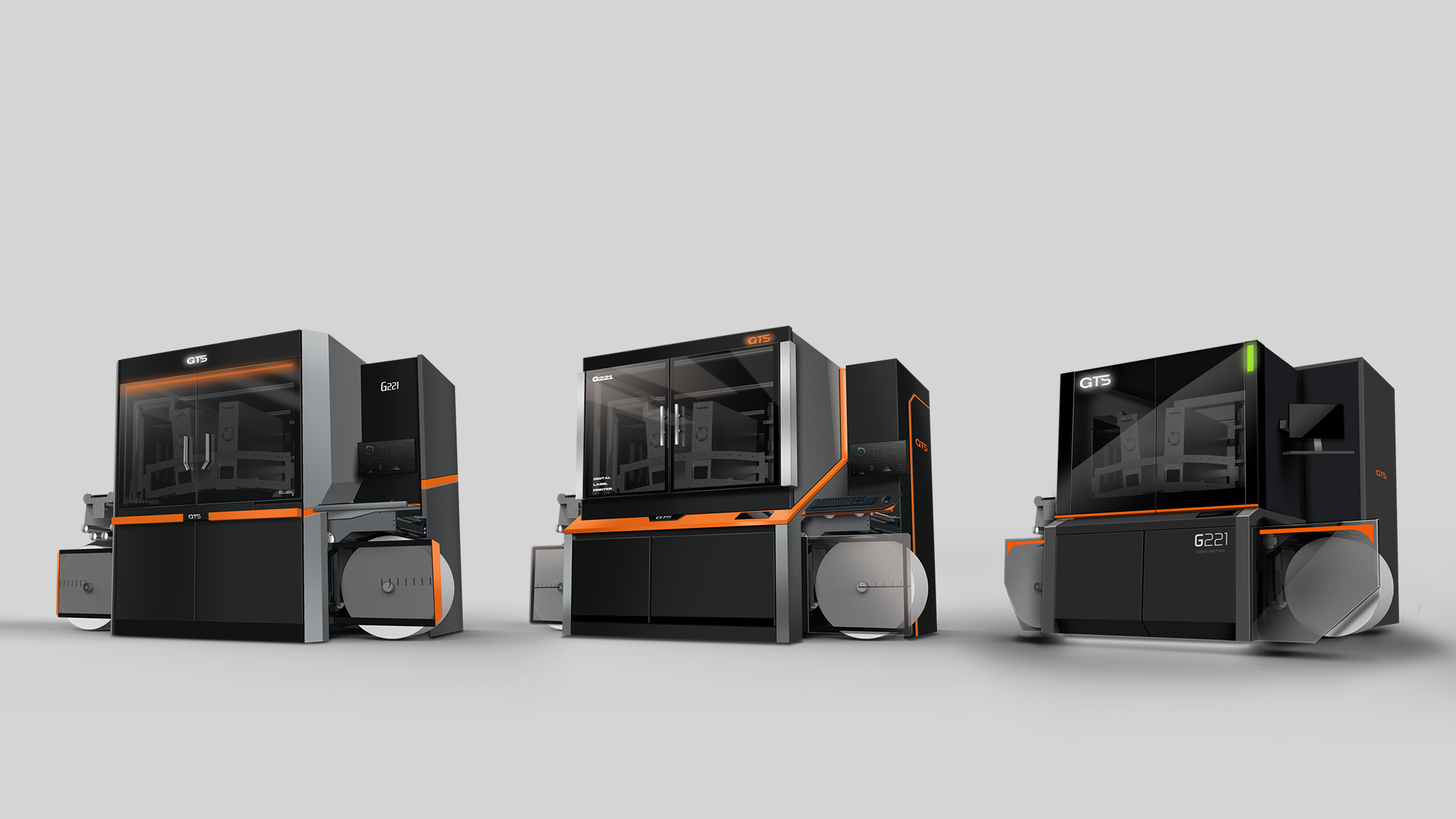 在健泓科技「數位標籤印刷機」的造型構思中,形碩設計將品牌核心的「GTS 賽車意象」轉化為具體的工業設計語彙。針對訪談中提到的操作疲勞、維修空間狹小及安全性等痛點,我們透過不同的幾何策略與材質應用,在確保中高階設備專業質感的同時,賦予機器高速、流暢且精密的操作體驗。