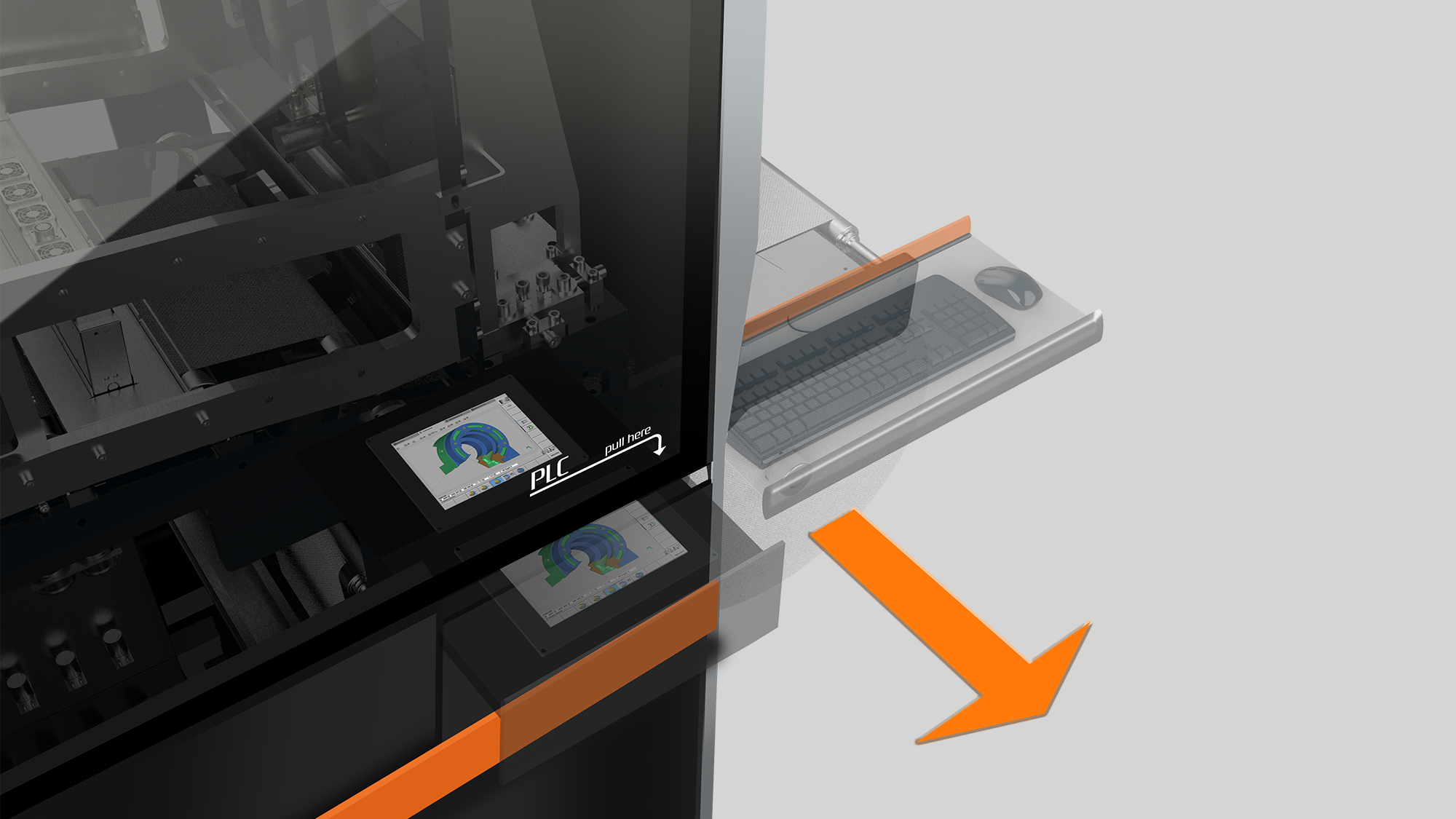 人因優化:PLC 操作面板採「抽屜式」隱藏設計,平時收藏於壓克力窗後保持外型簡潔,需使用時再拖拉操作,解決介面雜亂問題。