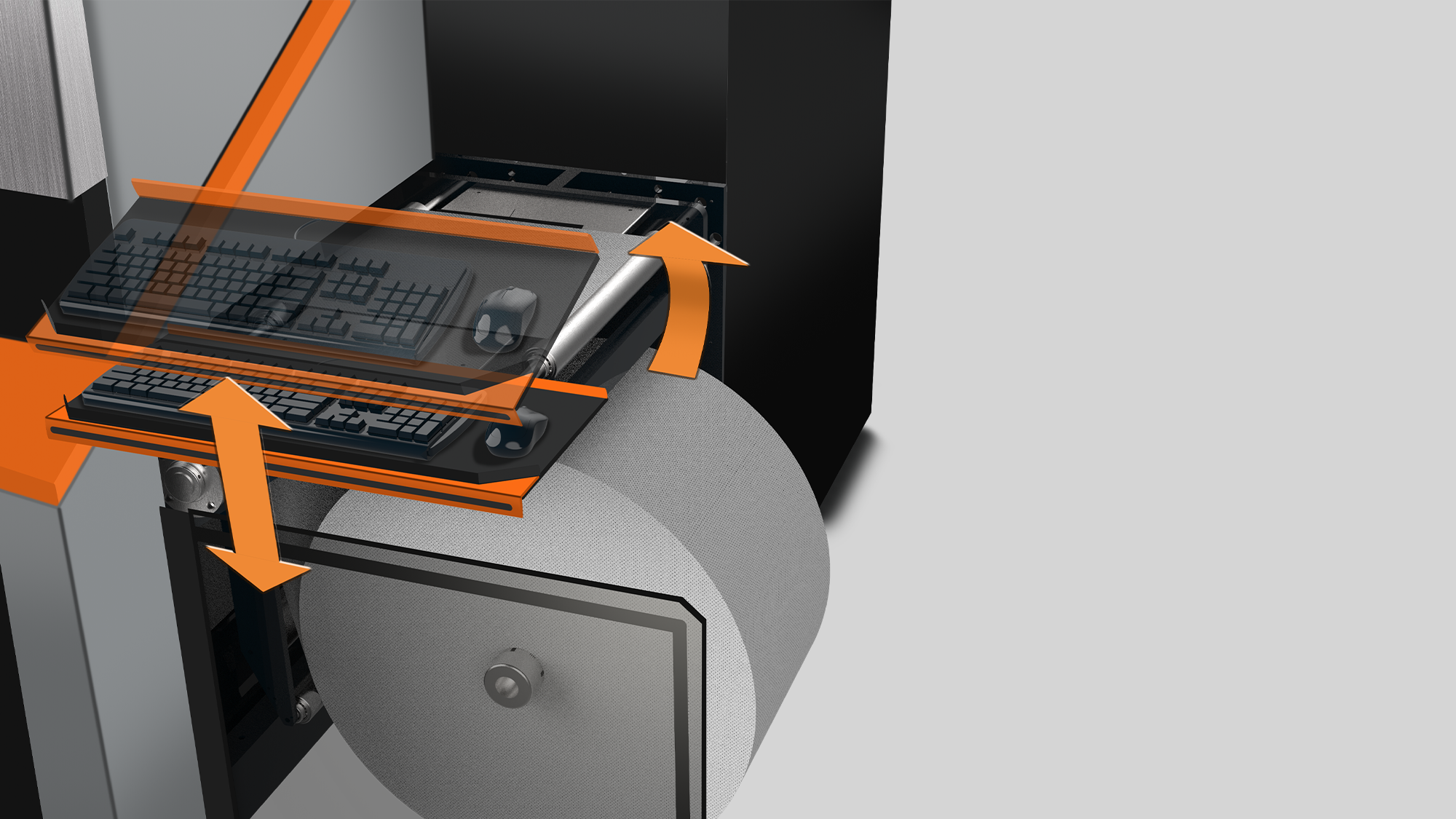 操作疲勞優化:針對不同身形,設計可「上下翻動」的鍵盤滑鼠底板,讓操作者能以最舒適的角度作業,歸位後亦不影響出紙區空間。