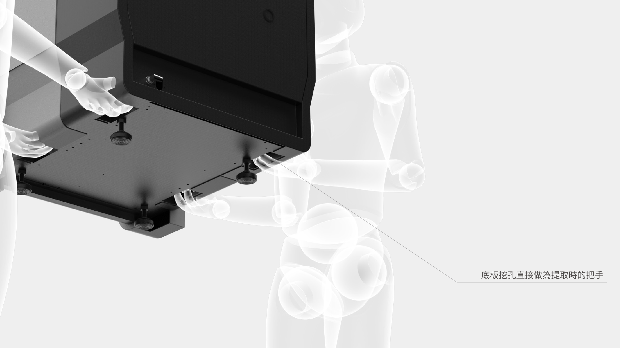 巧妙利用底板挖孔位,直接轉化為隱藏式內凹把手。此舉不僅維持了外觀的極簡流暢,更符合人因工程的施力點,讓搬運過程更趨穩定。