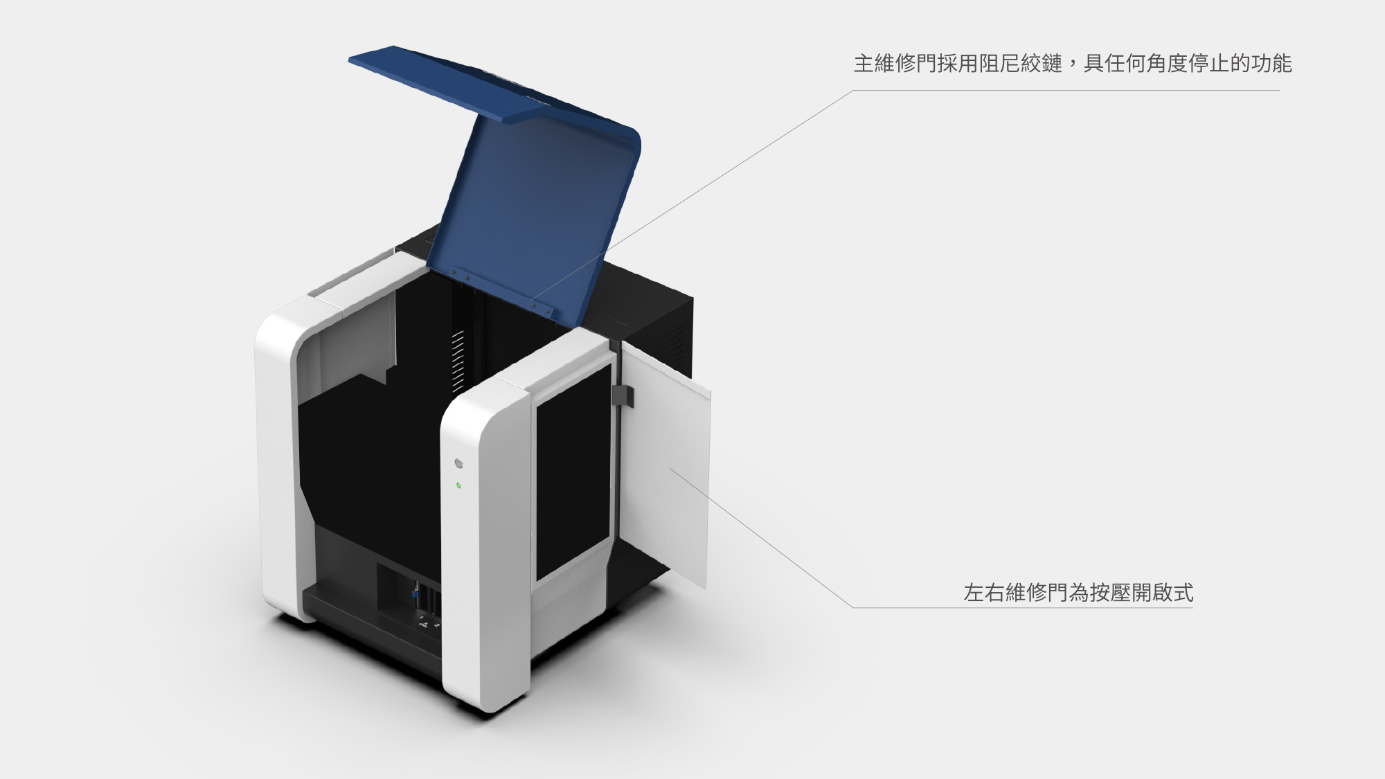 色彩計畫:全白機體完美融入臨床實驗室環境,局部點綴藍色透明壓克力,營造清爽且精準的視覺焦點。低彩度配置在專業感中帶入溫潤氛圍,透過色彩導引操作動線,傳遞出穩定且值得信賴的特質。