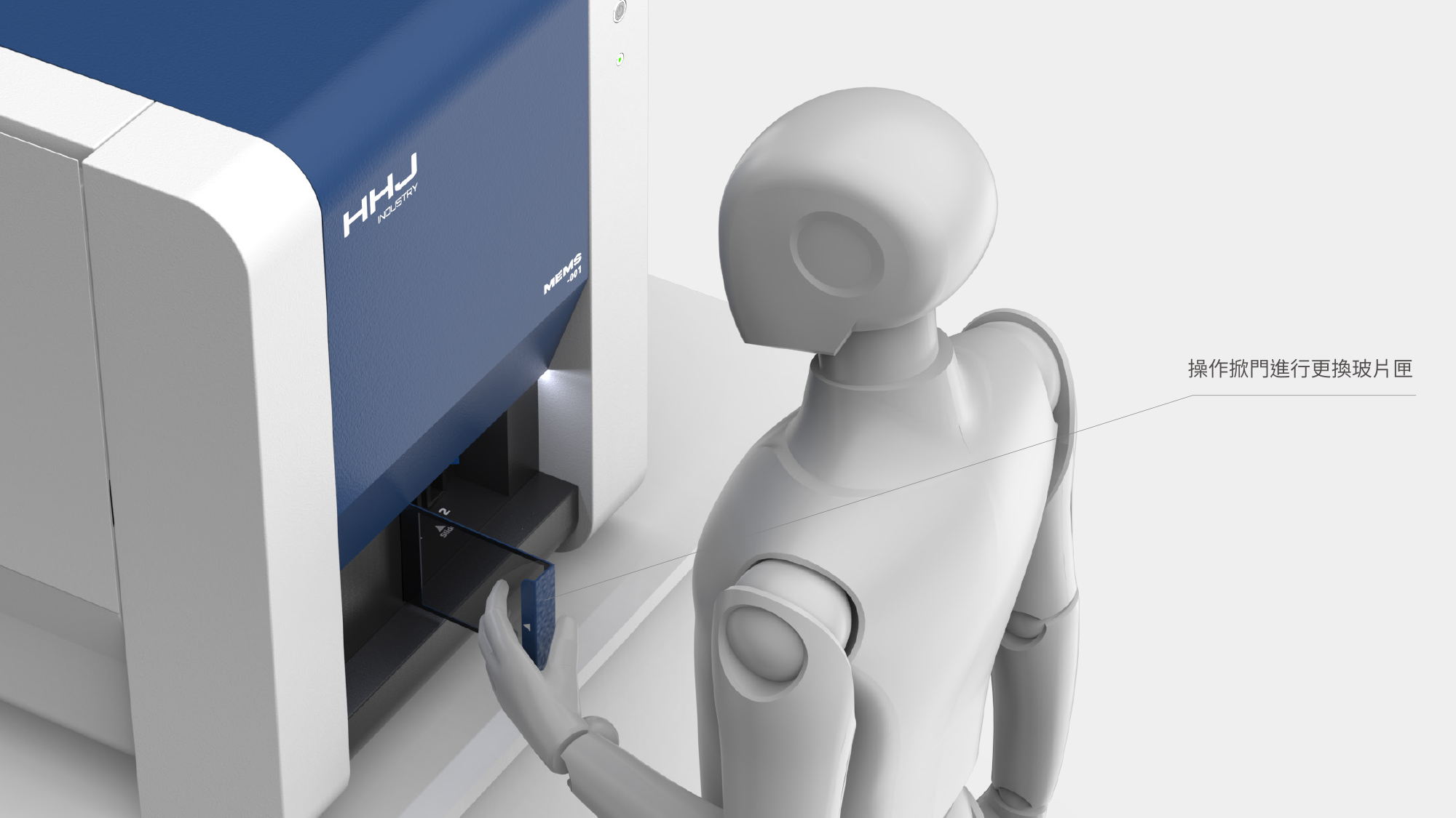 優化進料對位:上下玻片匣採用左掀門設計,玻片匣口改成白色,讓人工入料更精準流暢。