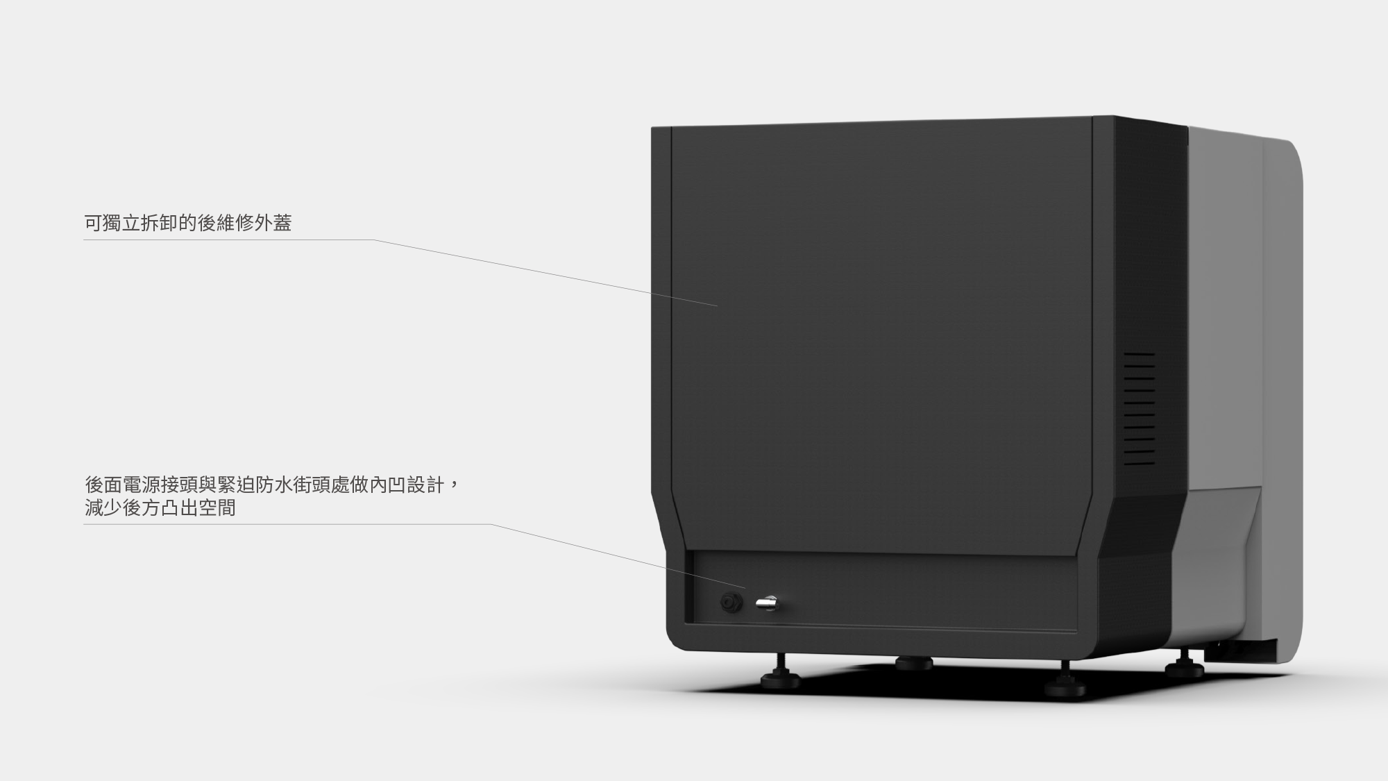 後方電源與防水緊迫接頭區域進行內凹處理,有效縮減線材凸出空間,使設備能更貼近牆面擺放,提升空間利用率。