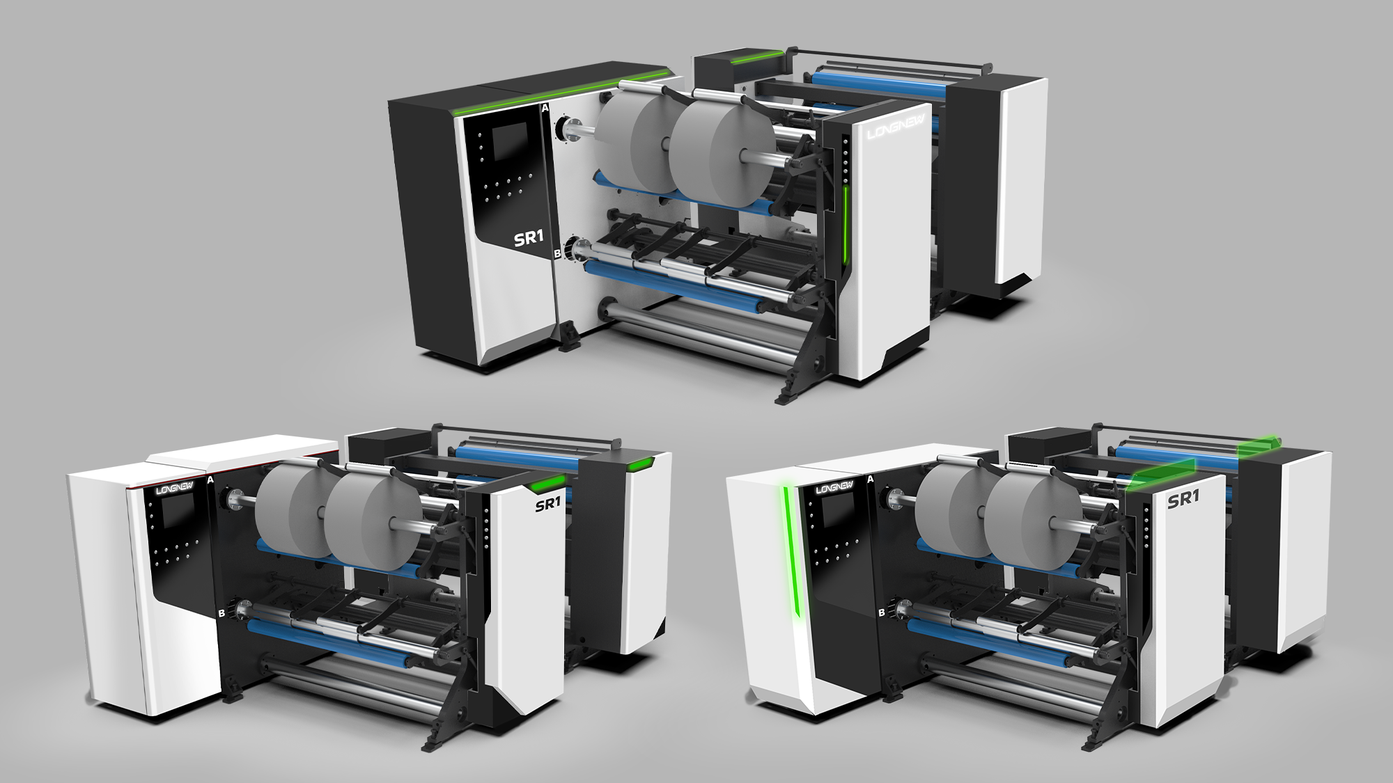 在高速分條機的設計過程中,形碩團隊致力於在緊湊的機身結構中,透過板金的摺疊、斷差與光點佈局,傳達出「精準分切」與「高速穩定」的視覺意象。我們提出了三款造型方案,旨在延續久馨品牌家族感的同時,進一步優化操作者的視認性與設備的科技質感。
