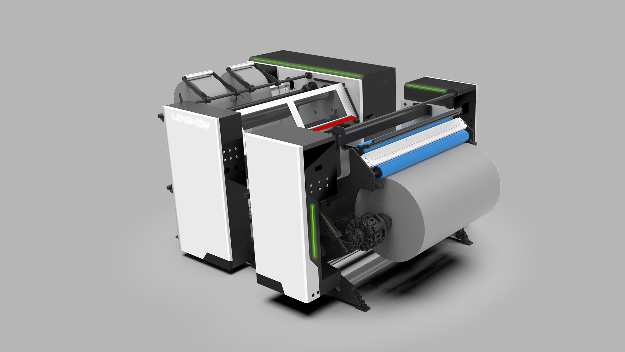 進入 3D 深化階段,我們將設計核心鎖定在「視覺輕量化」與「人機協作優化」。透過精確的板金展開與異材質接合模擬,我們解決了大型箱體在視覺上的壓迫感,並透過幾何連貫性,讓分條機與先前設計的印刷機、貼合機形成強烈的家族品牌感。