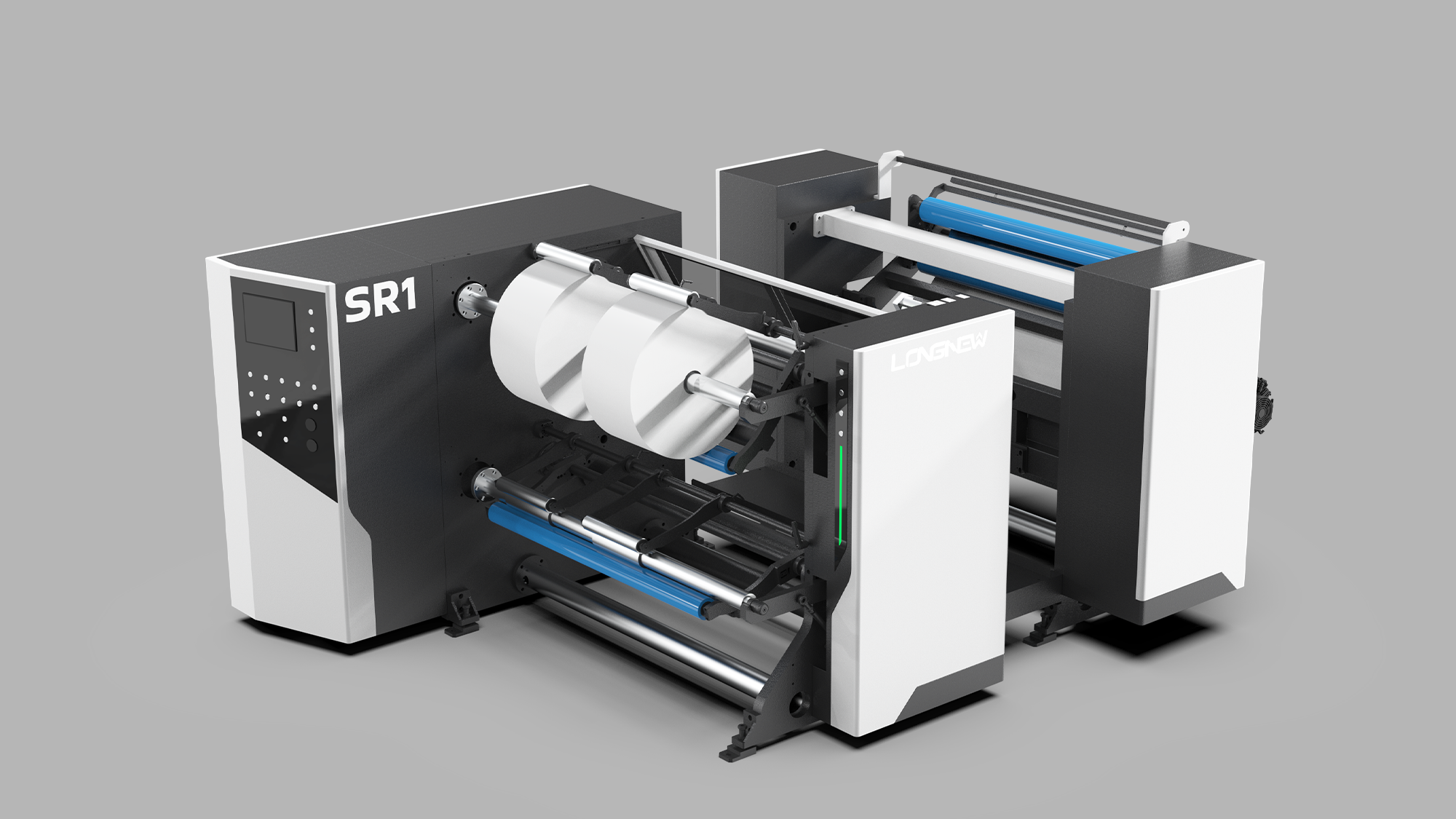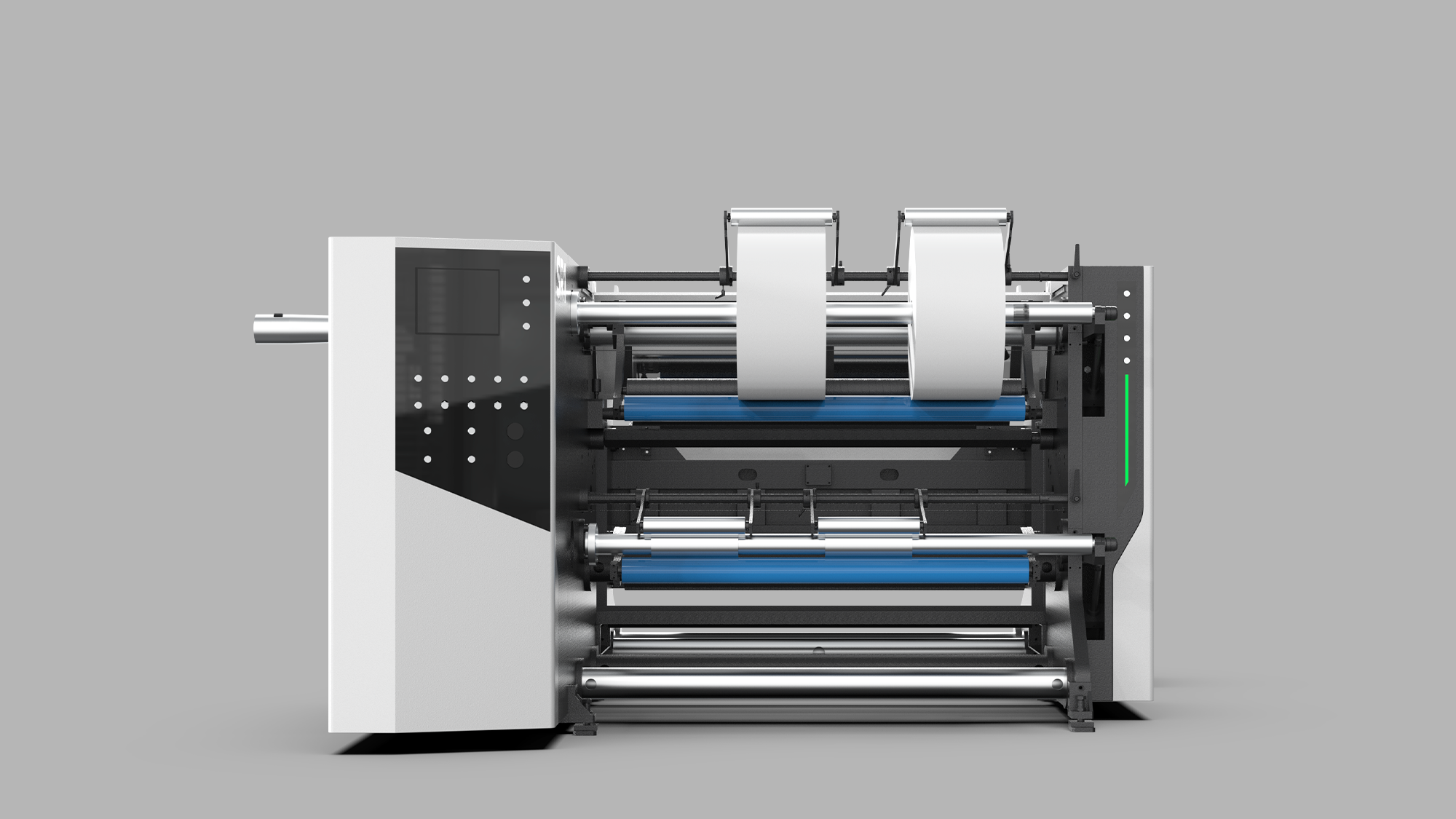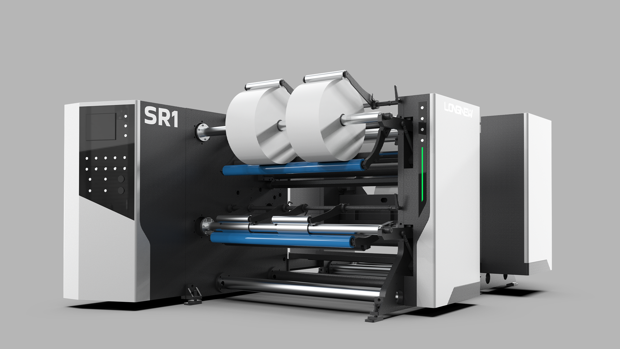 高速分條機具備高動能特性,設計挑戰在於傳達「高速下的絕對穩定」。形碩設計採用「幾何流線」與「模組化包覆」策略,將繁複滾軸與分切系統歸納於簡約板金殼體中。透過視覺重心分配與俐落摺面,傳達設備的高校穩定感,給予使用者專業且安心的操作回饋。