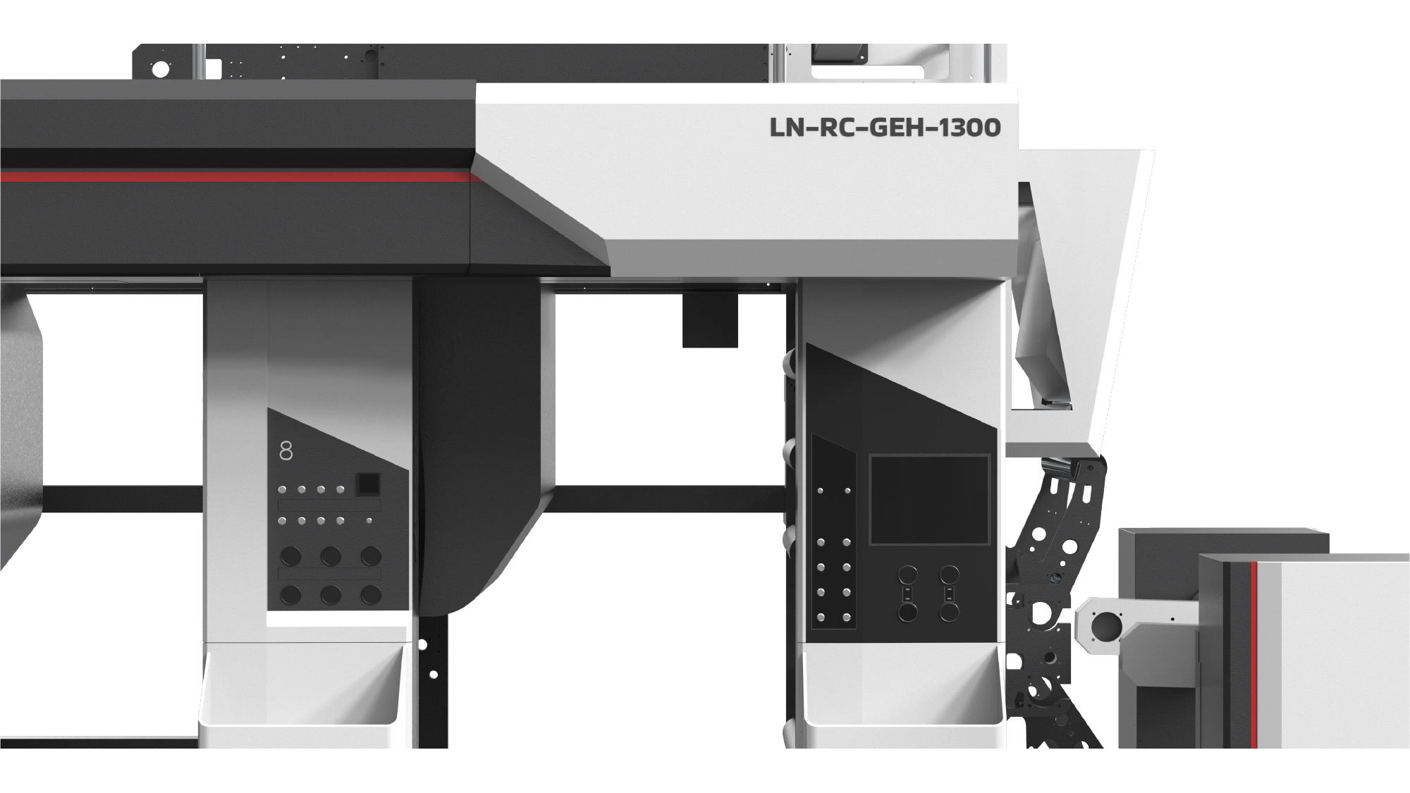 延續兩側圓弧的家族特色語彙,確保產品線的一致性。中央區段採用多層次板件疊加,結合紅色流暢線條,將原本零散的印刷單元整合為極具層次感的科技模組。