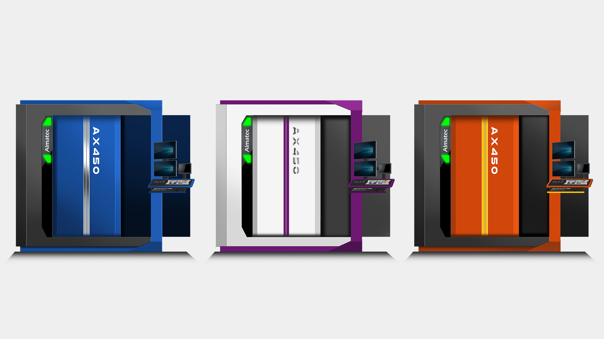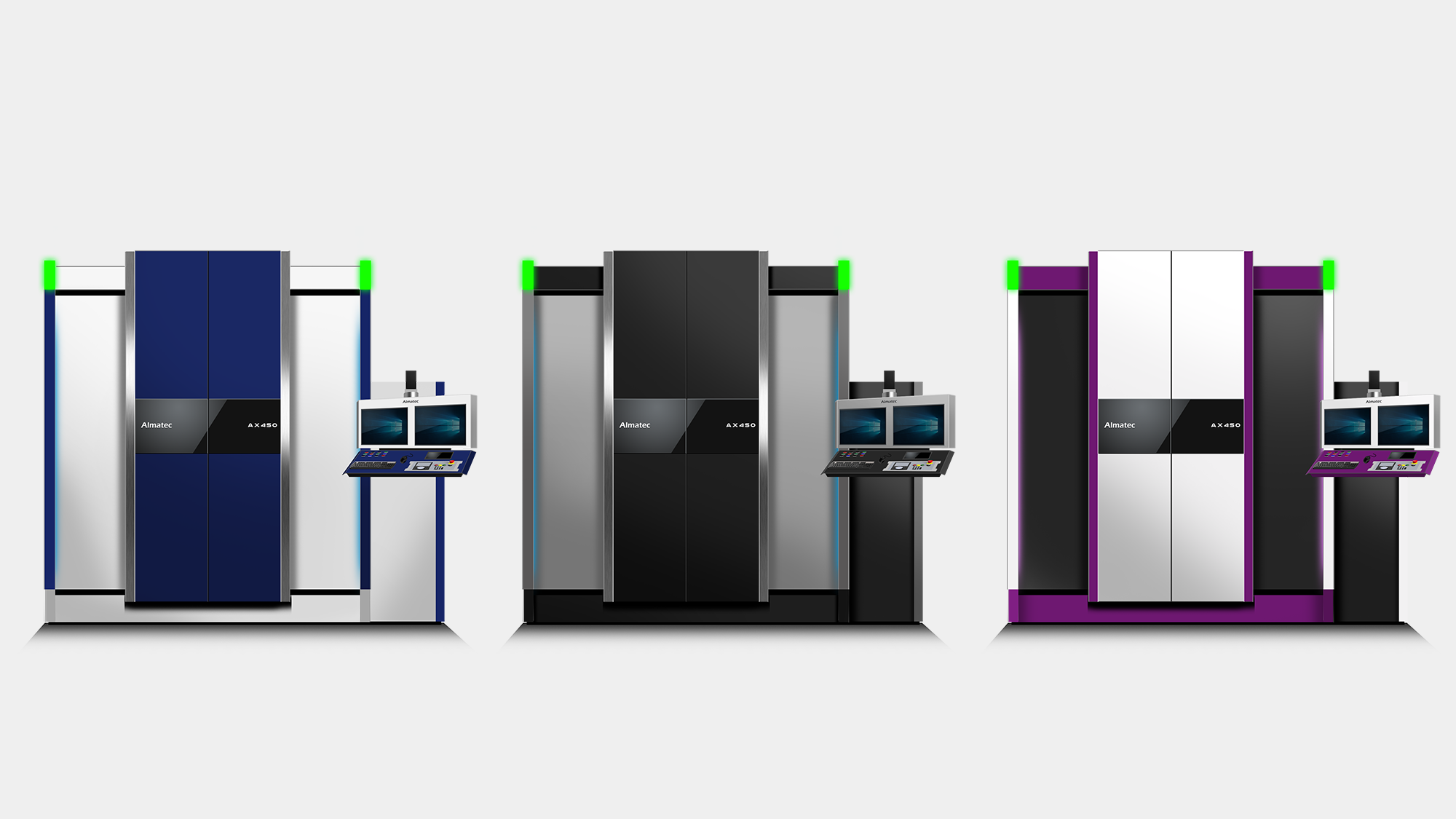 色彩計畫:提案 B 的色彩配置邏輯源於「精密檢測」的品牌意象,將設備視為一座微型的高科技建築。透過不同明度的灰色與異材質的冷調反光,賦予機台在大氣俐落之外,更具備深遠的視覺層次。